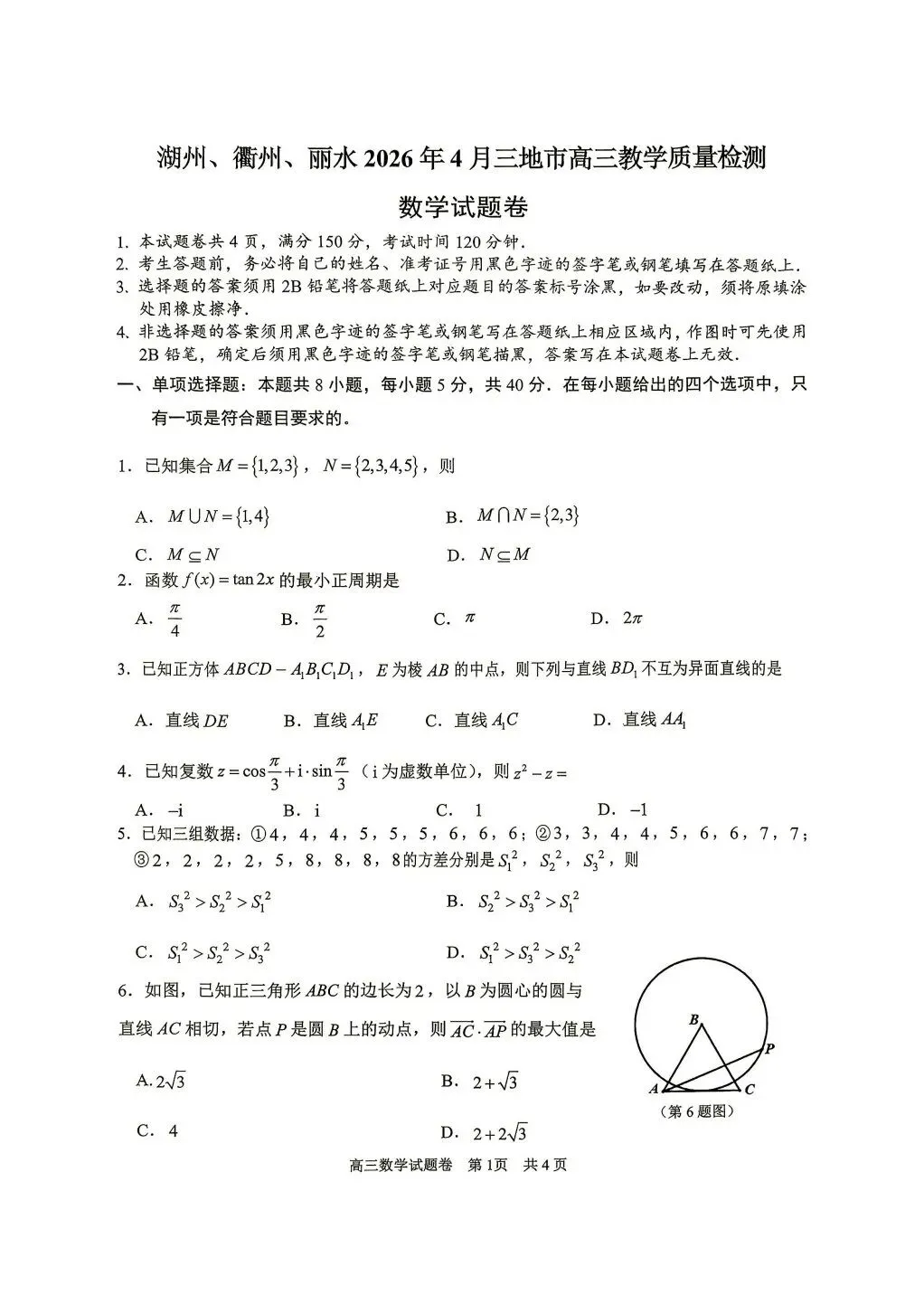 2026年4月湖丽衢二模数学试卷及答案(浙江地区最后一张二模卷)