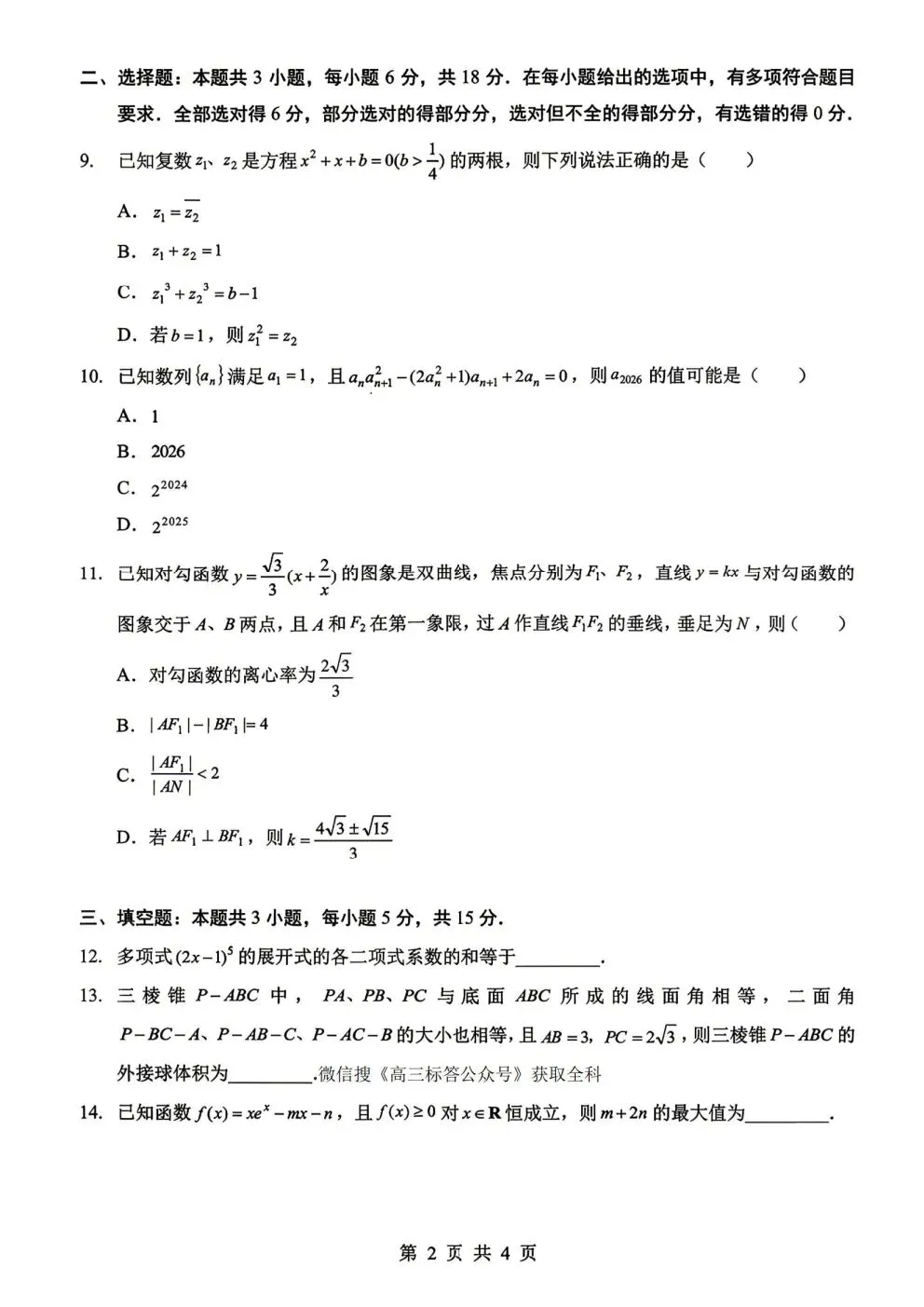 >2026湖北新八校联考4月高考数学试卷+答案解析(可打印)