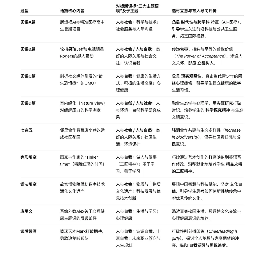 整卷选材在 广度 上全景覆盖了三大语境;在 时代性 上紧扣AI技术、数字化故宫与FOMO心理;在 育人导向 上,实现了文化自信、全球视野、心理健康与科学精神的同频共振,是一套极高水准的“素养立意”试卷。