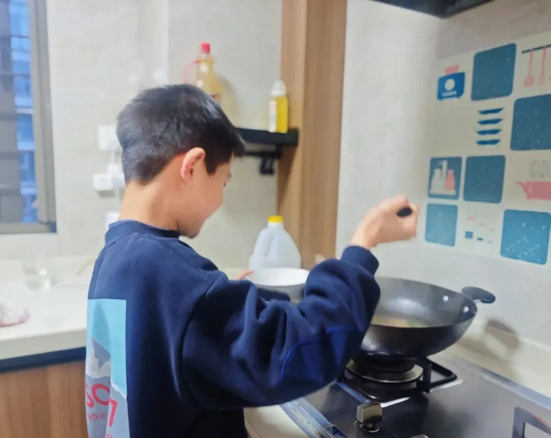 孩子现在放学是自己走路回家,比我还早到家,我一开门,就看见他小小的个子,站在灶台边认真煮菜的样子。