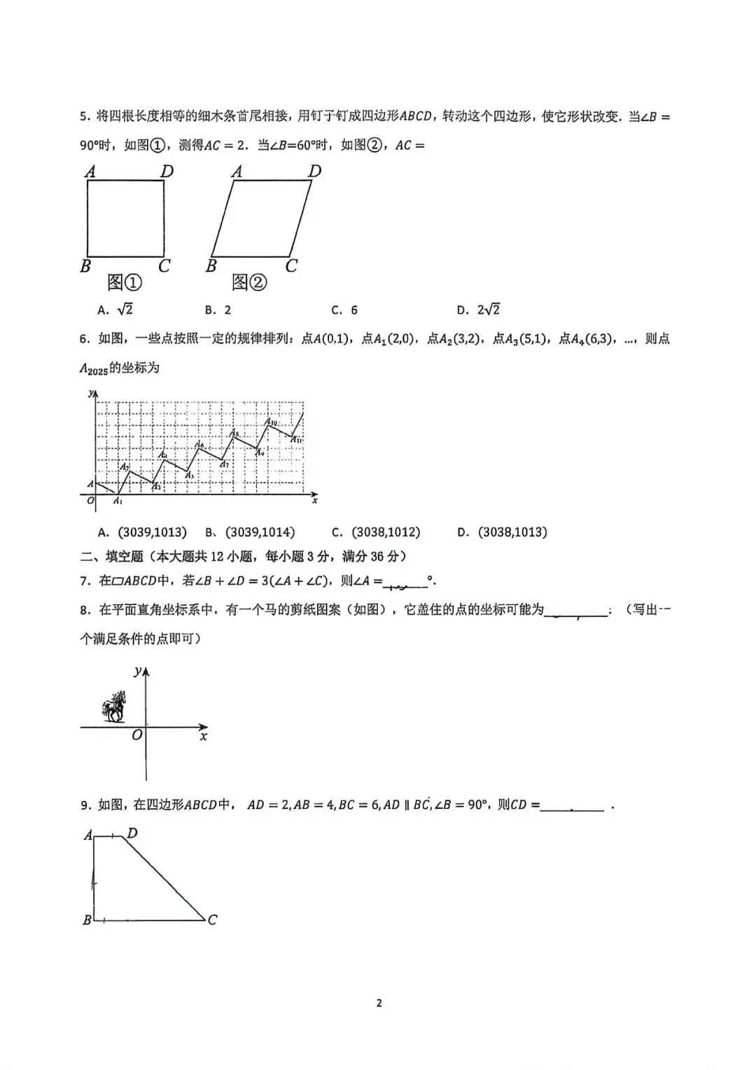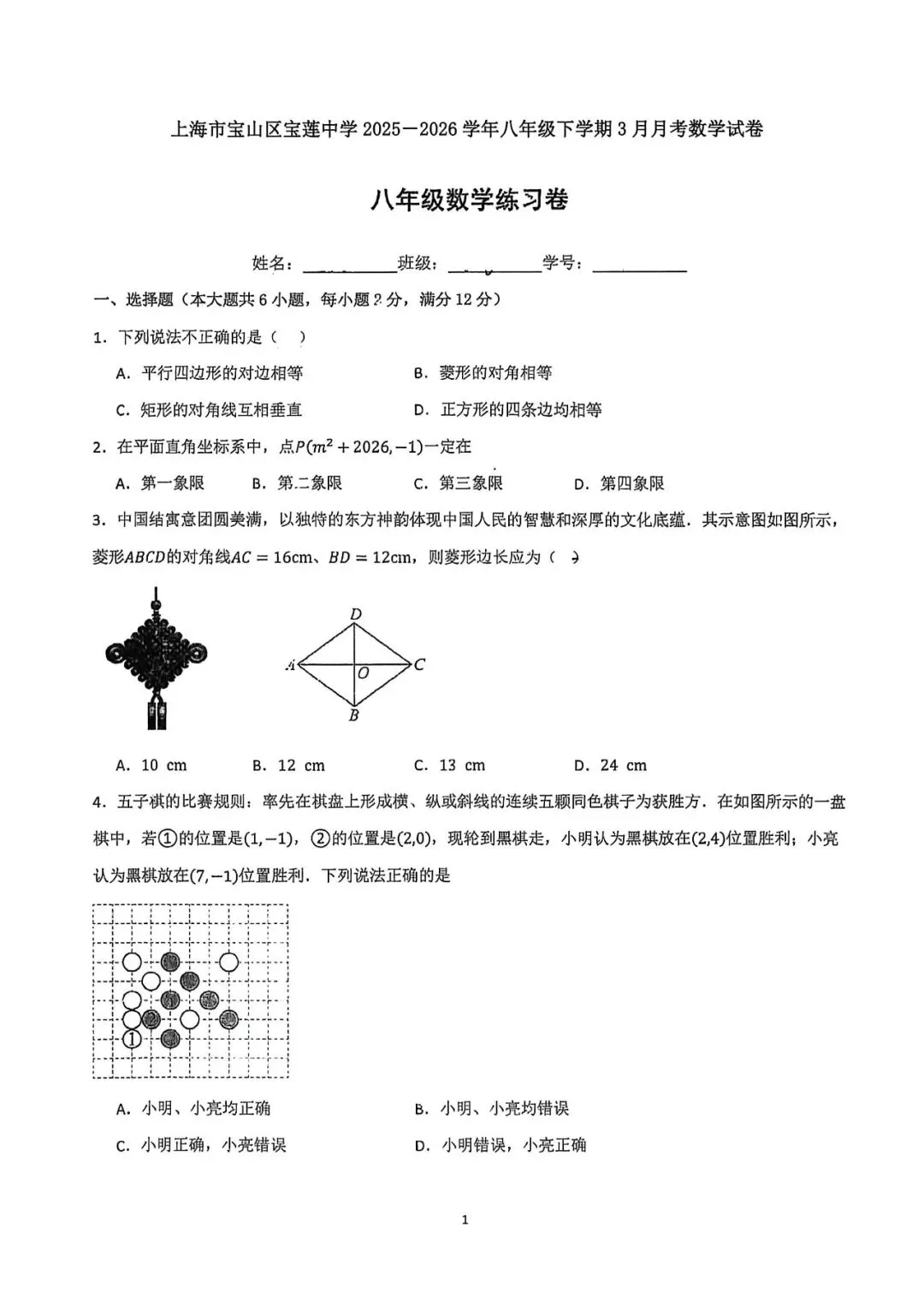 上海市宝莲中学八年级下学期数学月考试卷(2026.3)