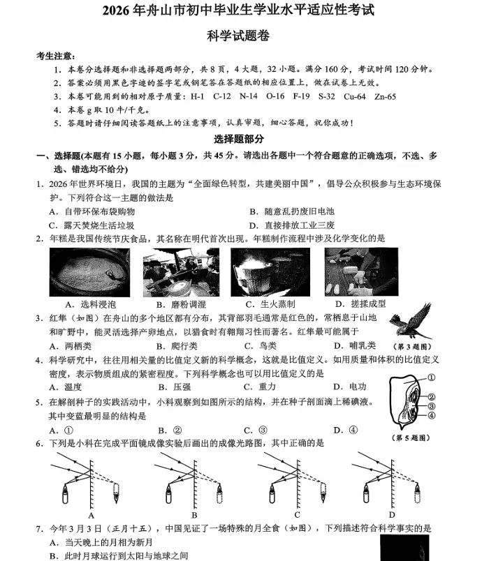 2026.4年浙江省舟山市统测一模试卷(附答案)