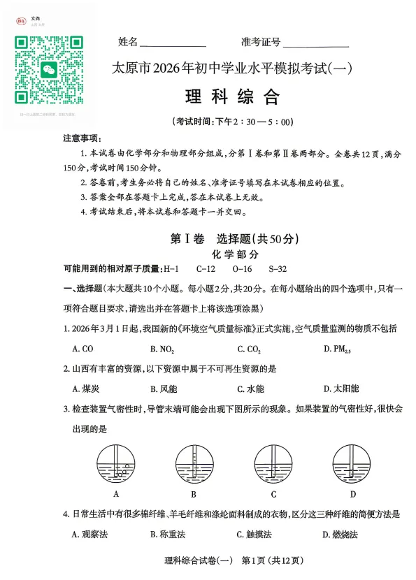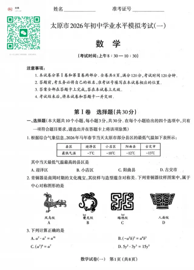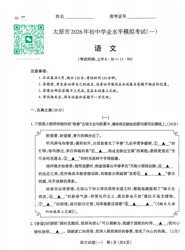 即可免费获取太原市一模完整电子版试卷+答案