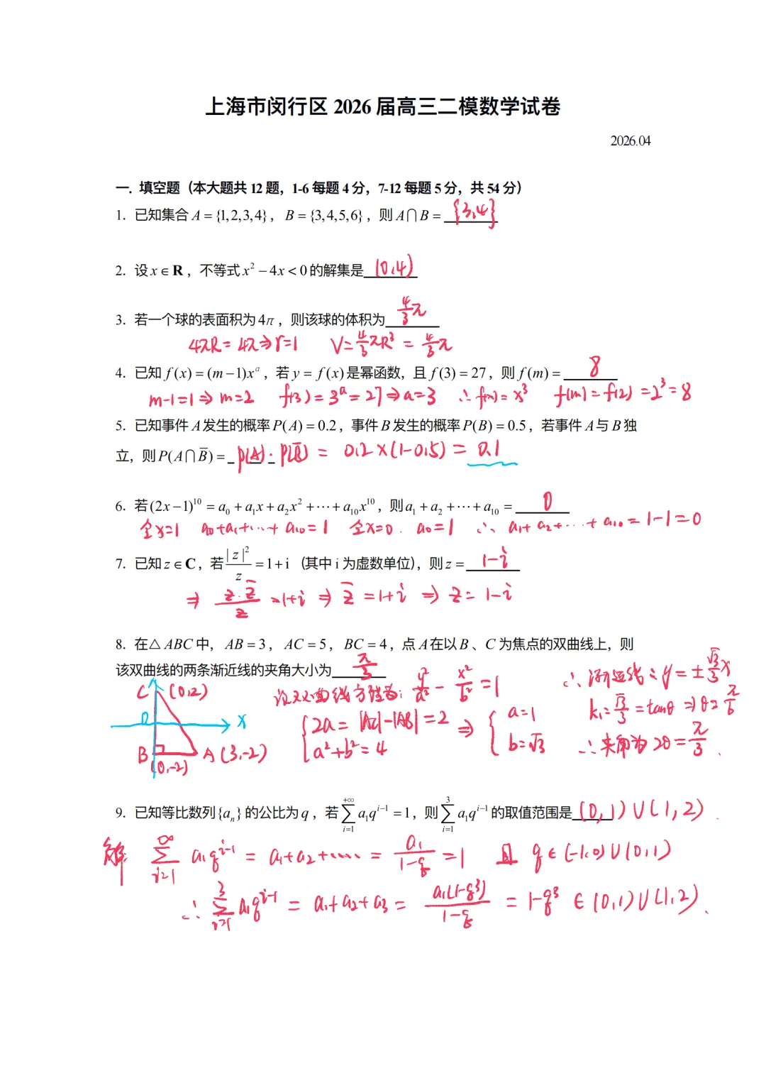 试卷分享0027:2026届上海奉贤区高三二模 数学(答案+难题详解)