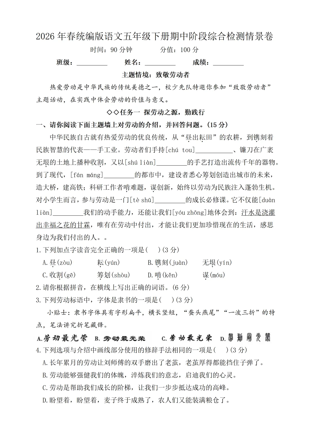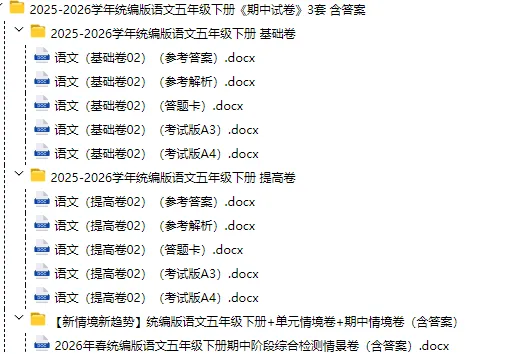 26春统编版(语文)五年级下册 期中试卷-含答案3套,免费领取!
