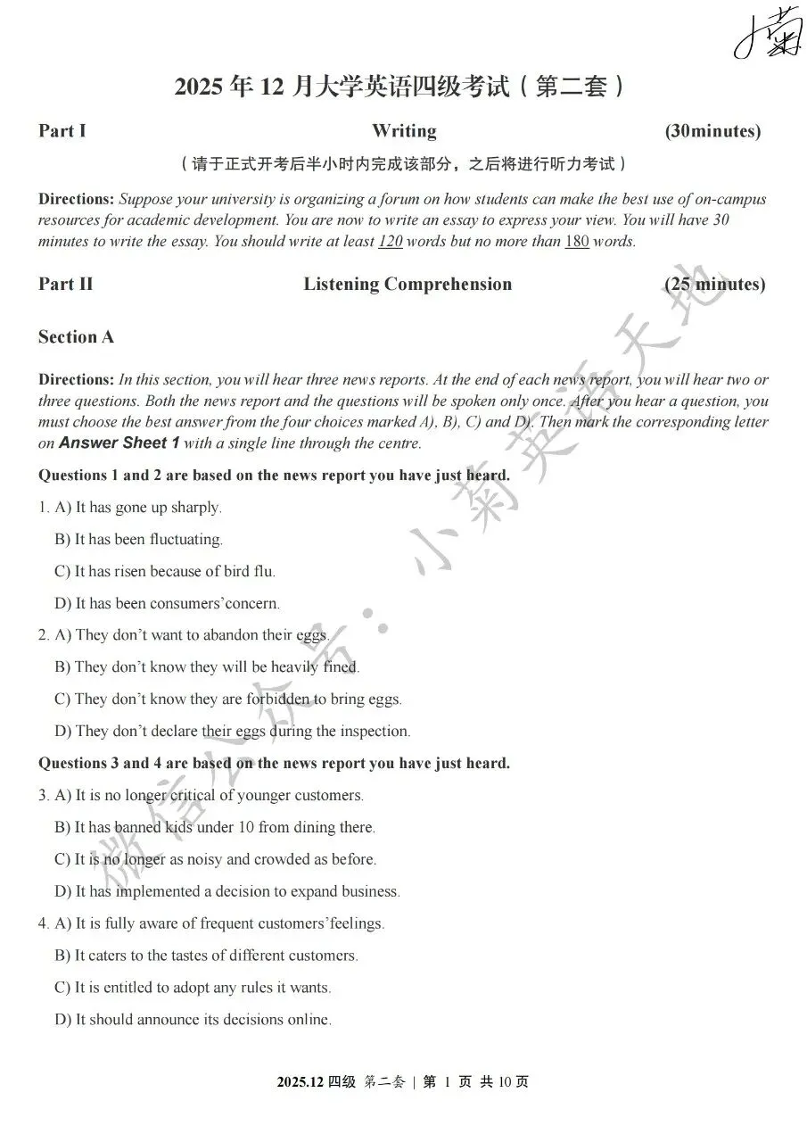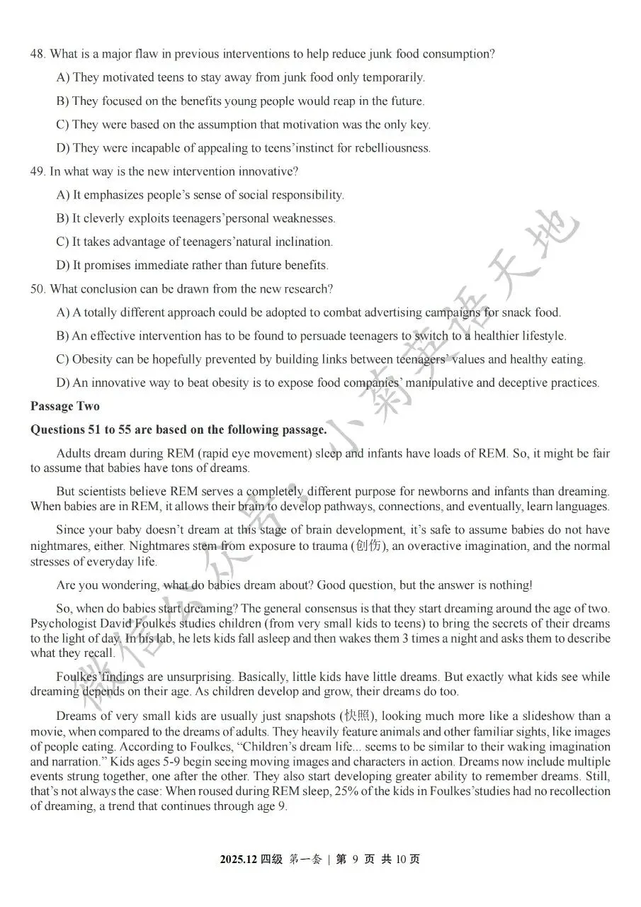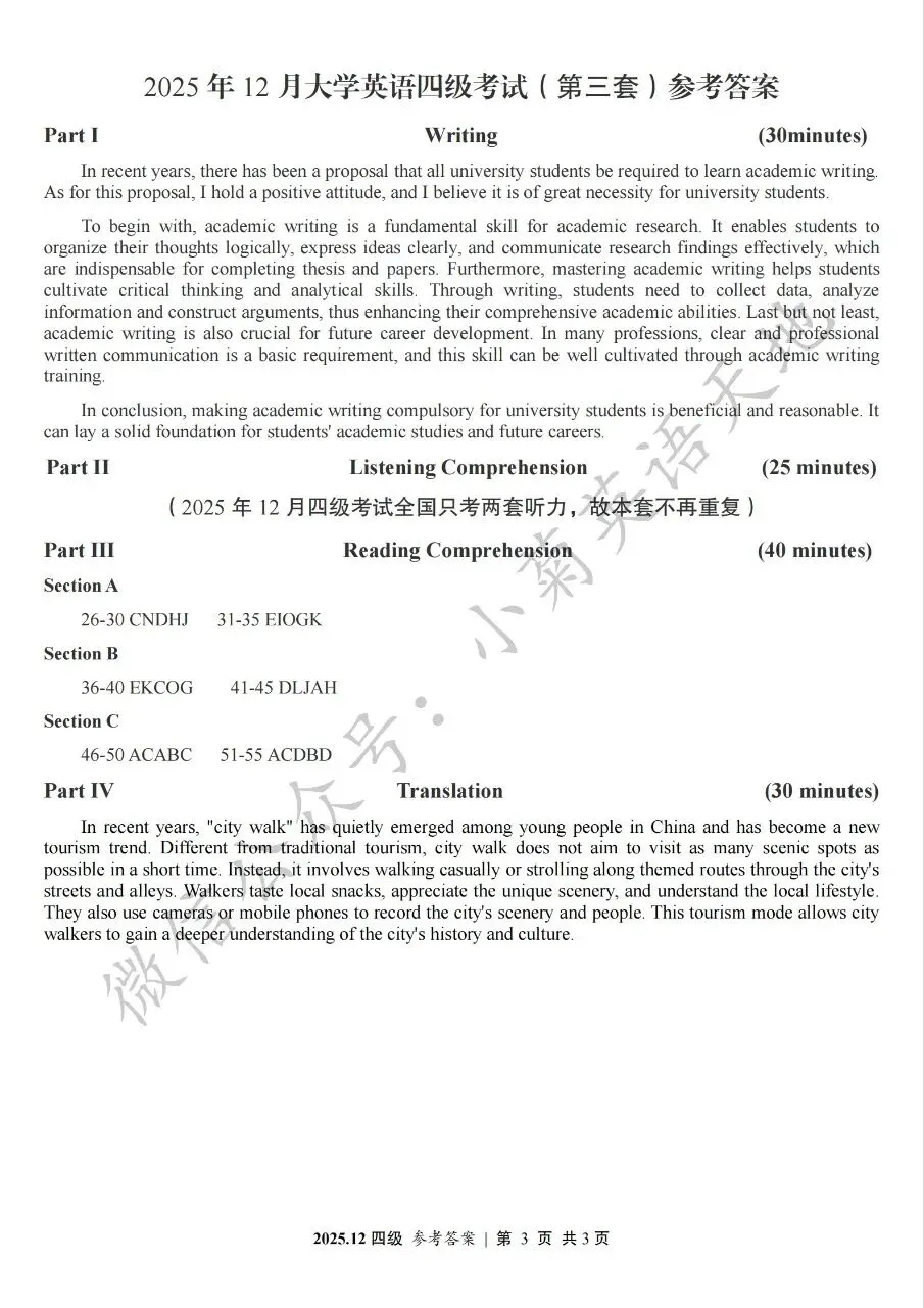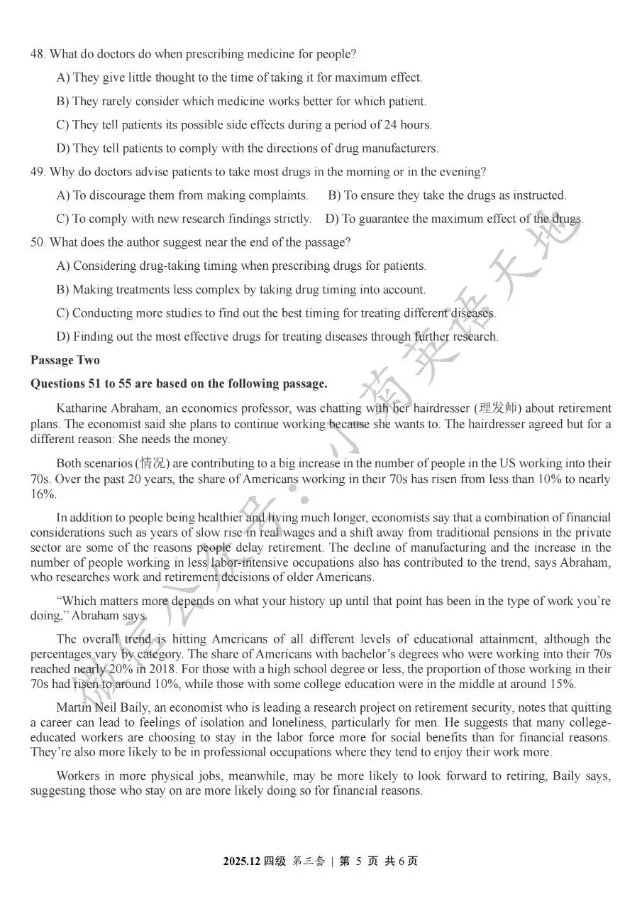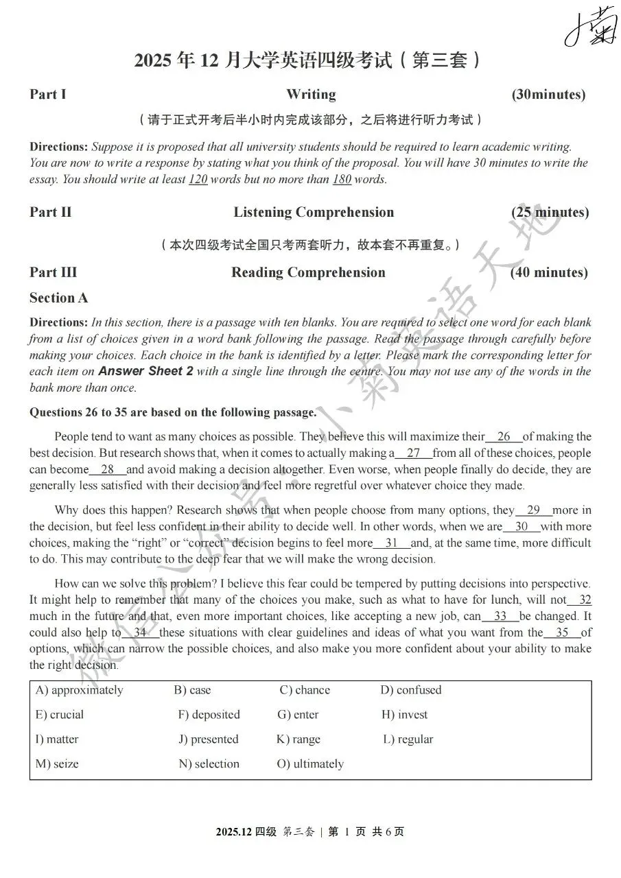 2026年6月大学英语四、六级考试在即,具体时间如下:为帮助广大考生演练四六级考试真题、提高做题质量与效率,近期我们将为大家陆续分享2025年6月、12月的大学英语四六级考试真题,同时包括答案与听力音频。本篇推文先为大家分享2025年12月大学英语四级考试真题(三套全)。需要注意的是,2025年12月全国大学英语四级考试只考两套听力,故第三套试题不含听力部分。可直接扫码或复制链接打开相应APP后转存后下载保存试题PDF文件以及听力音频MP3文件我用夸克网盘给你分享了「分享版N-202...第一套).pdf」,点击链接或复制整段内容,打开「夸克APP」即可获取。 /~0cb33Y8vWv~:/ 链接:https://pan.quark.cn/s/f7e6d85e9646我用夸克网盘给你分享了「分享版N-2025年12月大学英语四级考试(第二套).pdf」,点击链接或复制整段内容,打开「夸克APP」即可获取。