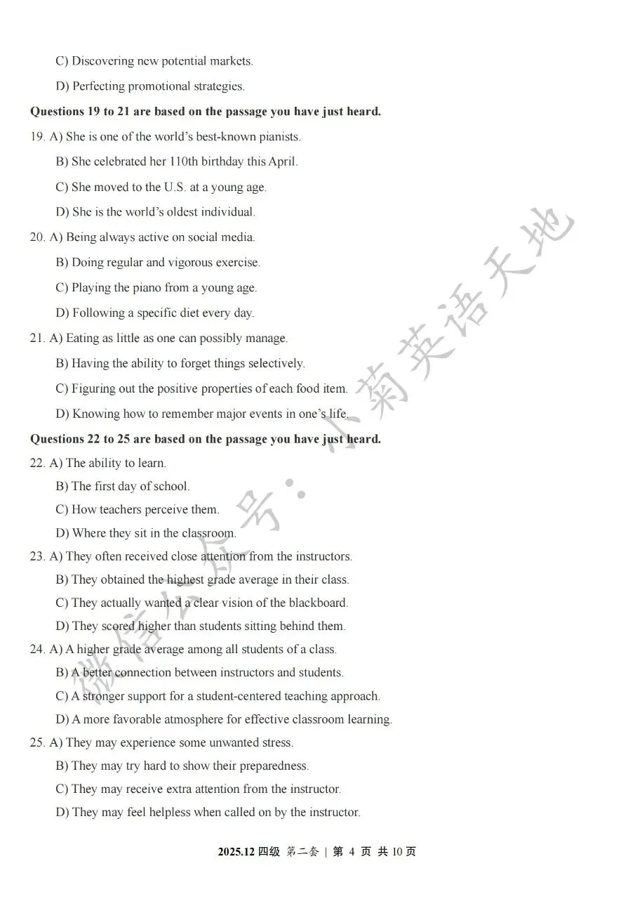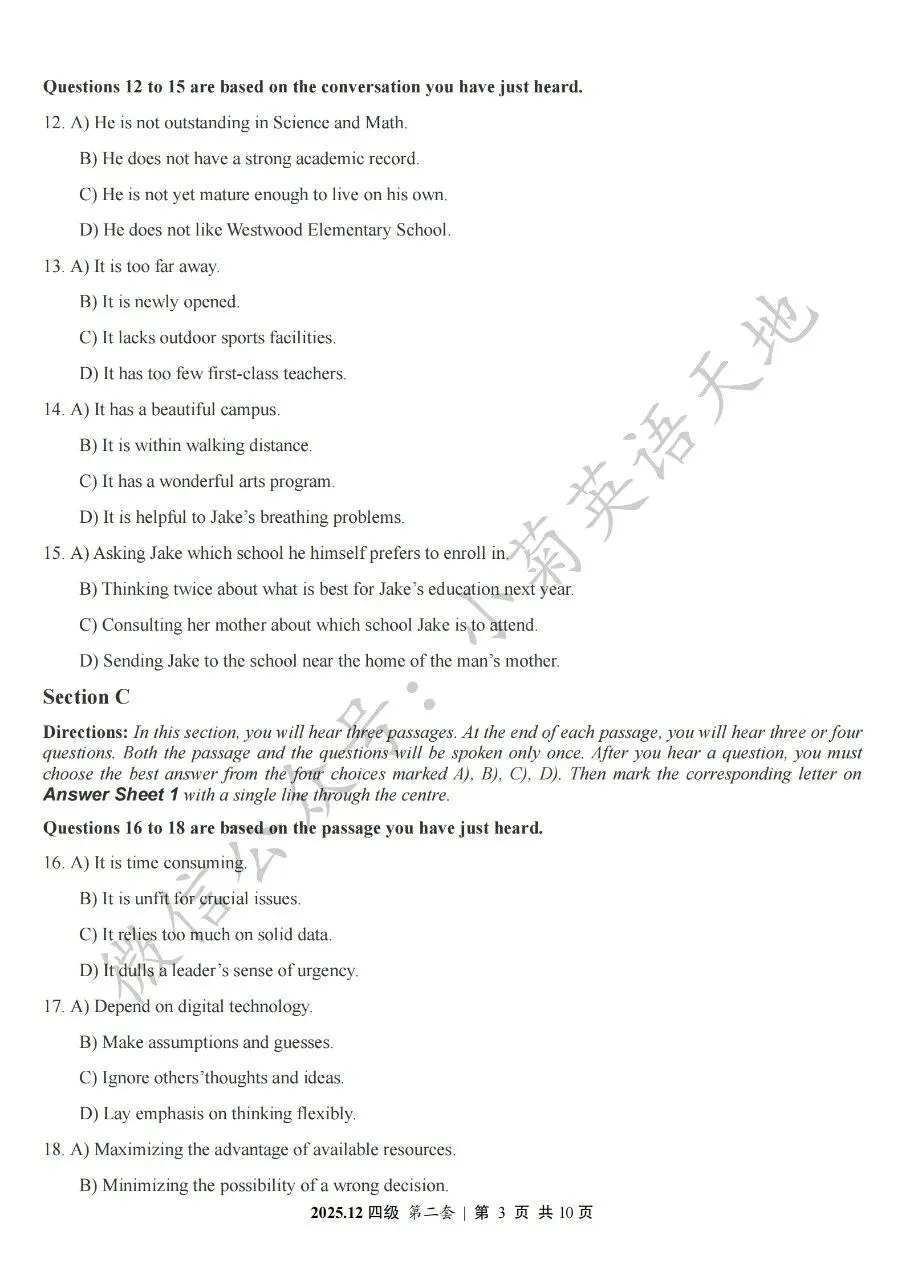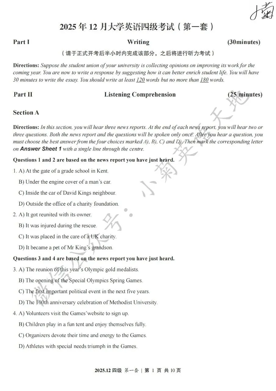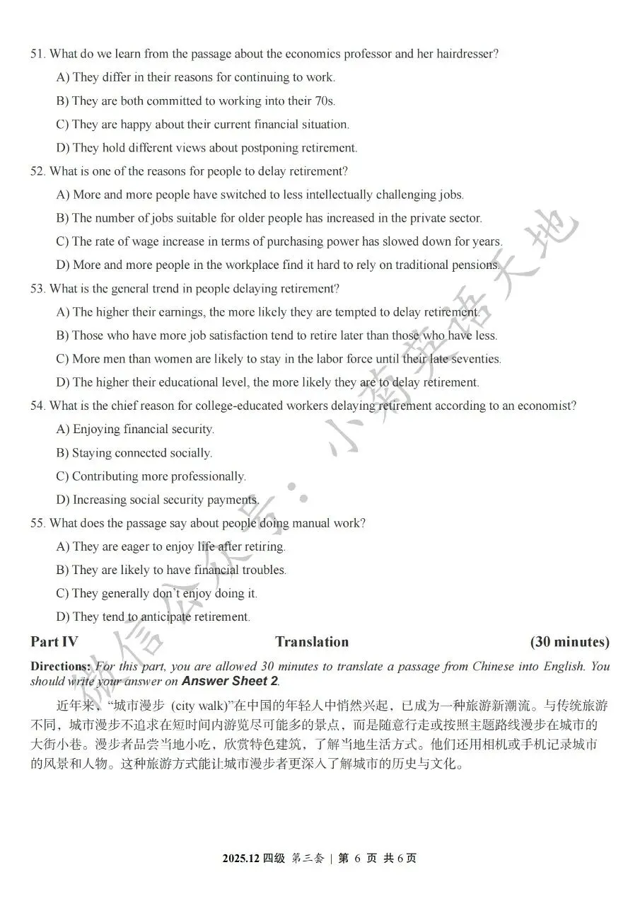 2026年6月大学英语四、六级考试在即,具体时间如下:为帮助广大考生演练四六级考试真题、提高做题质量与效率,近期我们将为大家陆续分享2025年6月、12月的大学英语四六级考试真题,同时包括答案与听力音频。本篇推文先为大家分享2025年12月大学英语四级考试真题(三套全)。需要注意的是,2025年12月全国大学英语四级考试只考两套听力,故第三套试题不含听力部分。可直接扫码或复制链接打开相应APP后转存后下载保存试题PDF文件以及听力音频MP3文件我用夸克网盘给你分享了「分享版N-202...第一套).pdf」,点击链接或复制整段内容,打开「夸克APP」即可获取。 /~0cb33Y8vWv~:/ 链接:https://pan.quark.cn/s/f7e6d85e9646我用夸克网盘给你分享了「分享版N-2025年12月大学英语四级考试(第二套).pdf」,点击链接或复制整段内容,打开「夸克APP」即可获取。