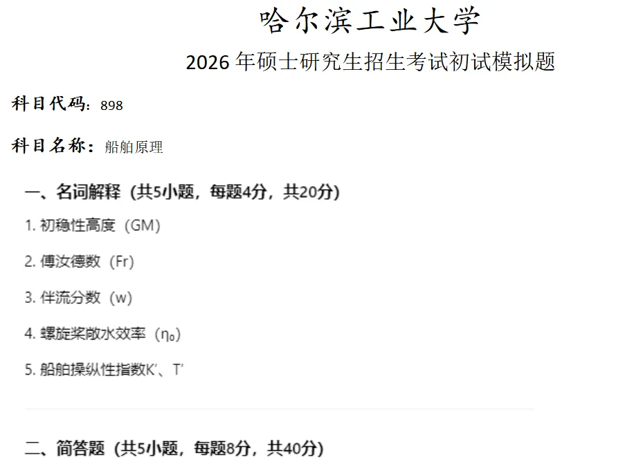 当前位置:首页>考研真题>哈尔滨工业大学898船舶原理考研真题模拟