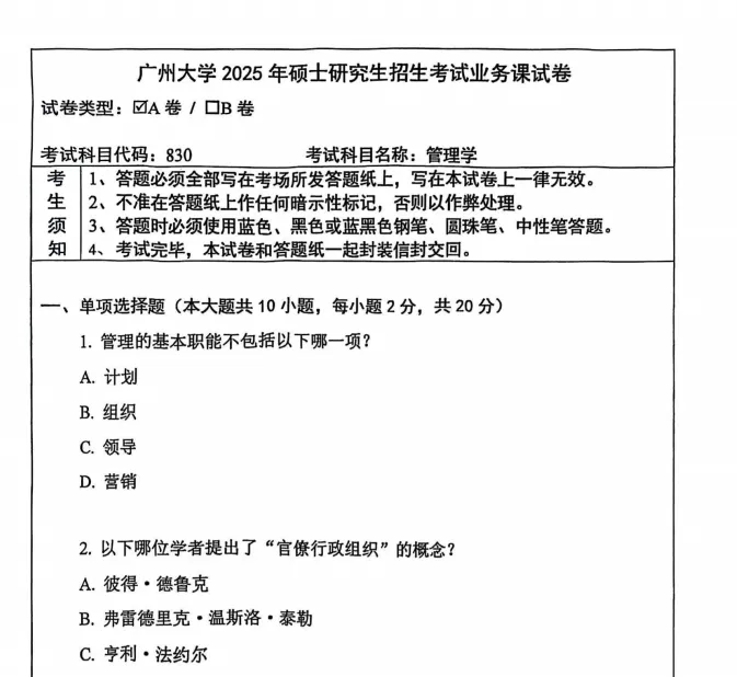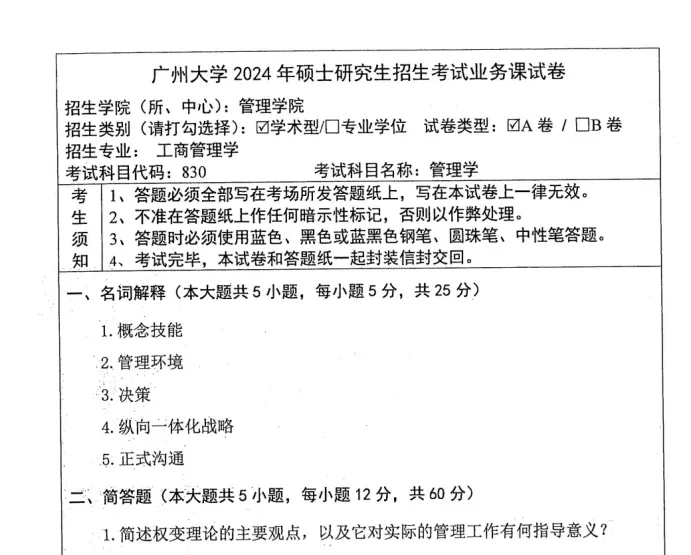 2012-2025年广州大学830管理学考研真题试卷