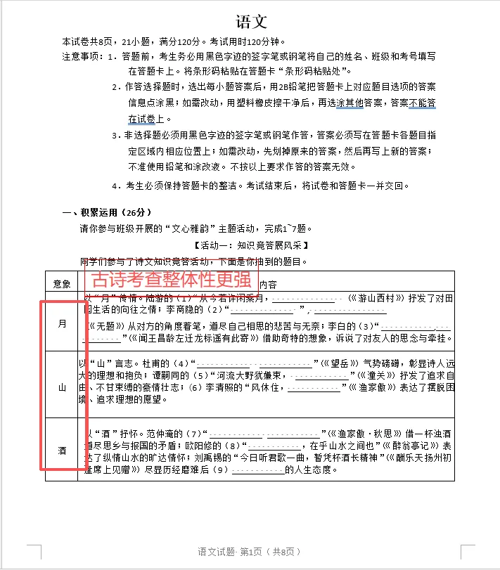 积累运用 | 默写、基础、传统文化、名著、仿写、病句 | 7题 | 26分 | 21.7% |