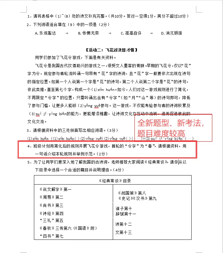4、名著阅读(4 分) | 考查《经典常谈》目录匹配,指向整本书阅读的核心素养。 |
