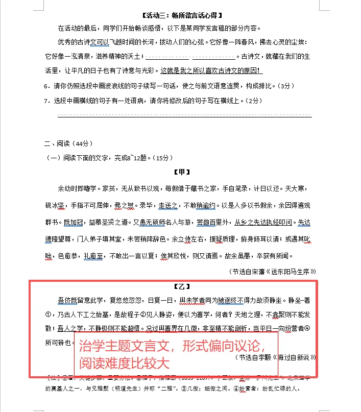 5、文言文阅读(15分) 课内《送东阳马生序》+ 课外《悔过自新说》(治学主题) | 实词辨析(始、善、翕、过) | 课内外文言迁移,重文言基础 + 思辨感悟,贴合中考 “以文载道” 理念。 |