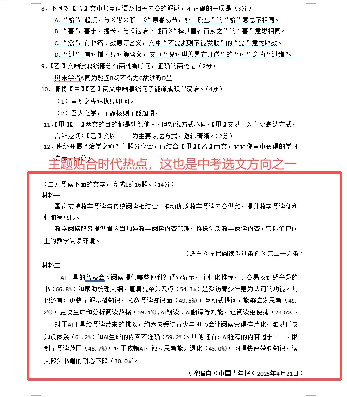 6、实用类文本阅读(14分) 非连型议论文 | 信息筛选 | AI 时代的阅读(社会热点),紧扣时代命题;实用阅读能力,重信息整合、思辨分析、知识迁移,这也是这几年广东中考的题型 |