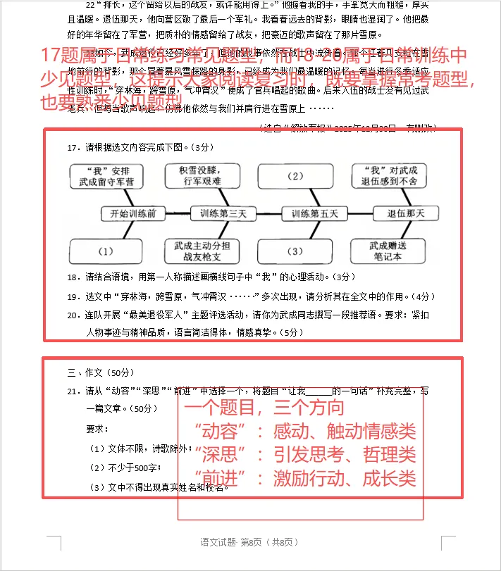 8、作文(50·分) | 题目:半命题 **《____让我的一句话》**(三选一:动容、深思、前进) | 立足学生成长体验,三个方向: “动容”:感动、触动情感类 “深思”:引发思考、哲理类 “前进”:激励行动、成长类 |