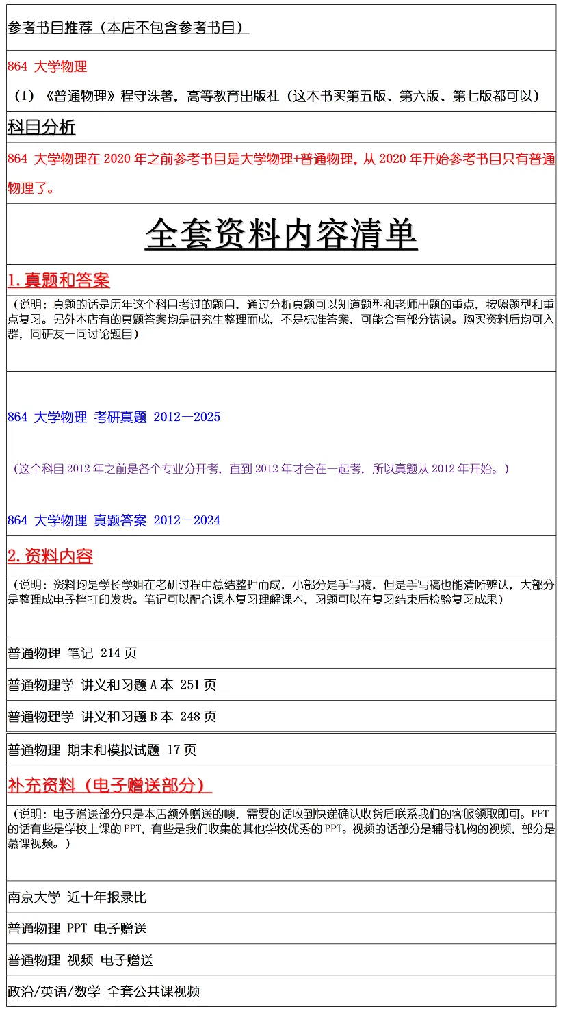 我的一轮准备过程是先看一遍书,然后把例题做了,课后题选做,因为课后题的量太过庞大,可以挑一些重点的课后题做一做,我大概在九月上旬结束一轮复习。然后我在二轮的时候把考研真题当做主要目标(这里不得不强烈推荐小南学姐家的864真题,市面上没有比小南学姐家真题更全的了,这里小小打个广告哈哈哈)。我是按照力学,热学,光学,电磁学,振动和波这五部分考研真题分开来做的(咱们大物应付考研初试只需要研究这五部分即可,其余部分不需要看,大概就是1-3章和5-12章)。然后我是在10月底完成专业课第二轮的复习。第三轮的复习主要围绕着课后的重点题进行,我基本做了光学和电磁学的课后题,其余部分则是压了一些典型的课后题(因为时间不太够了)。我觉得这可以作为一个思路,因为南京大学的大物近几年出题比较喜欢出几道偏难怪的课后题原题,可以重点看看光学和电磁学的课后题,那里出难题的概率比较大。