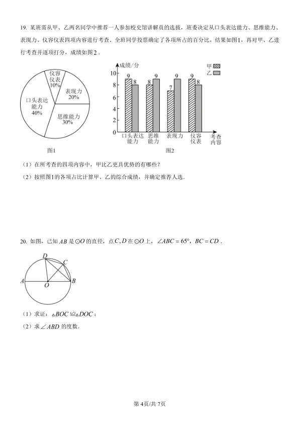 第2题的众数计算、第15题的简单概率、第19题的加权平均与决策推荐……这些题目背景真实、数据清晰,考查了考生处理数据、分析问题的能力。尤其是第19题,要求根据扇形统计图和条形统计图计算综合成绩并确定推荐人选,这与贵州中考中常见的“统计与决策”类题目高度吻合。