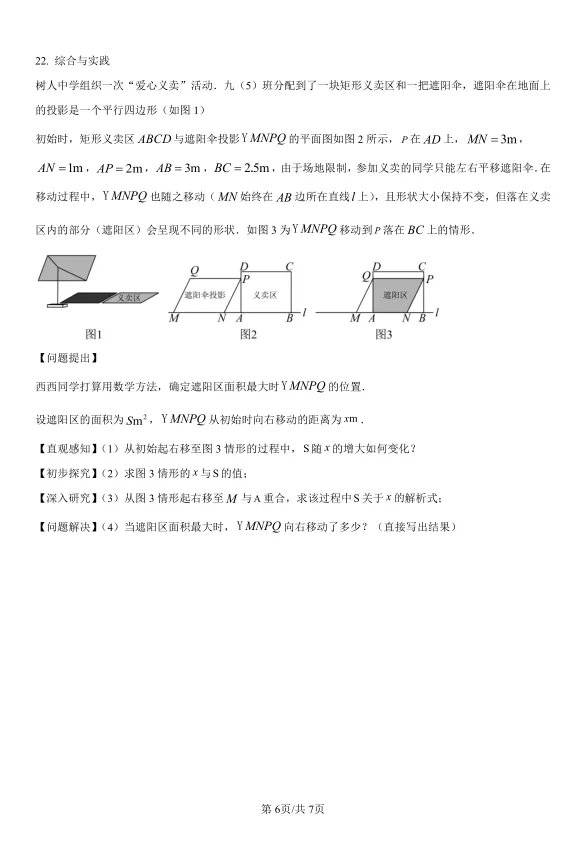 这份试卷最值得称道的是第12题“双曲线阶梯”和第22题“遮阳伞平移”。两道题都巧妙地将函数与几何图形变化结合起来:第12题利用反比例函数图象上点的坐标特征,结合平行于坐标轴的线段长度,求出阶梯的高,考查了数形结合思想。第22题则以遮阳伞平移为背景,让学生探究遮阳区面积随移动距离的变化规律,从“直观感知”到“初步探究”,再到“深入研究”和“问题解决”,四个问题层层递进,引导考生经历完整的数学探究过程。