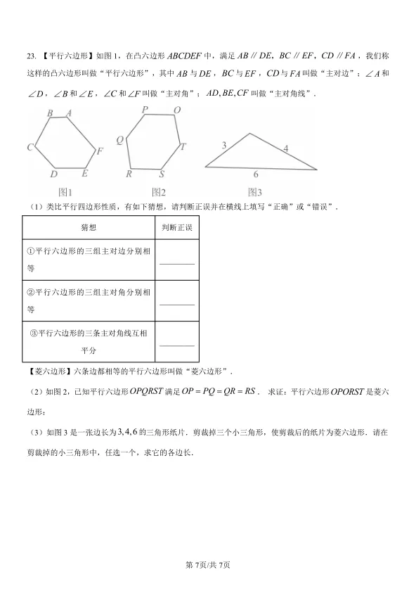 第20题的圆综合题(全等三角形证明、角度计算)、第22题的遮阳伞平移问题(动态几何与面积函数)、第23题的“平行六边形”新定义探究题……几何题由浅入深,层层递进。尤其是第23题,类比平行四边形性质进行猜想,再证明“菱六边形”,这种新定义探究型问题正是近年来中考的热门题型,贵州考生可以借此训练自己的类比迁移和逻辑推理能力。