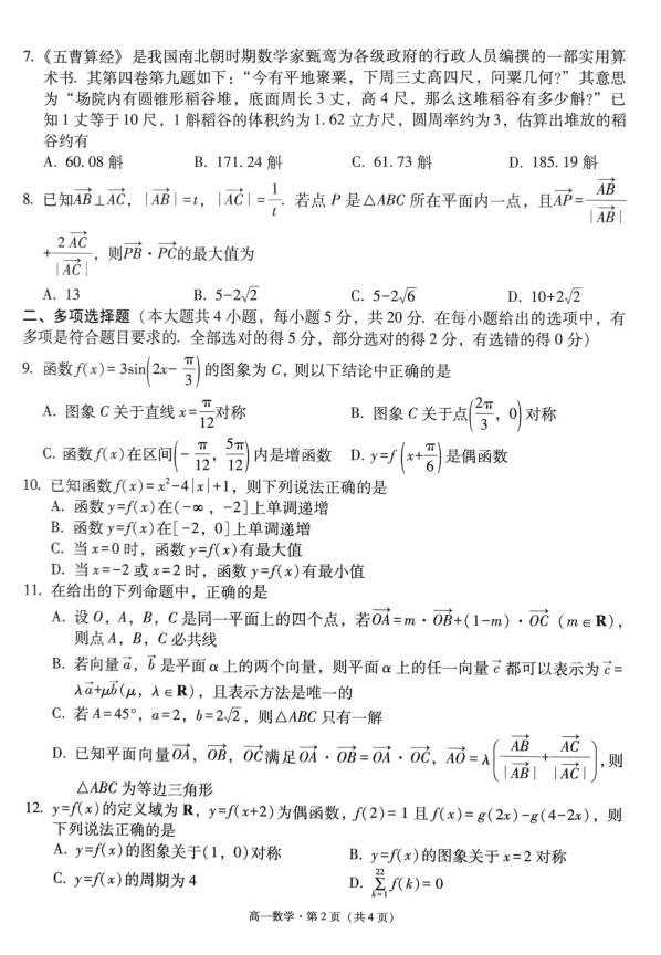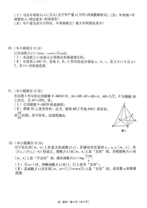 试卷涵盖了高一上学期数学的主要内容,包括:复数:纯虚数、复数运算、共轭复数等;函数与不等式:对数比较、二次函数恒成立、函数零点、函数图像变换;三角恒等变换与解三角形:正弦定理、余弦定理、面积公式、三角函数的图像与性质;平面向量:向量共线、垂直、数量积、模长、向量表示法;立体几何:线面平行、异面直线、锥体体积、表面积、空间位置关系;实际应用:利润优化问题、稻谷堆体积计算(传统文化题);尤其是第12题抽象函数的对称性与周期性、第22题新定义“友好”函数,对学生的逻辑推理能力和数学语言理解能力提出了较高要求。