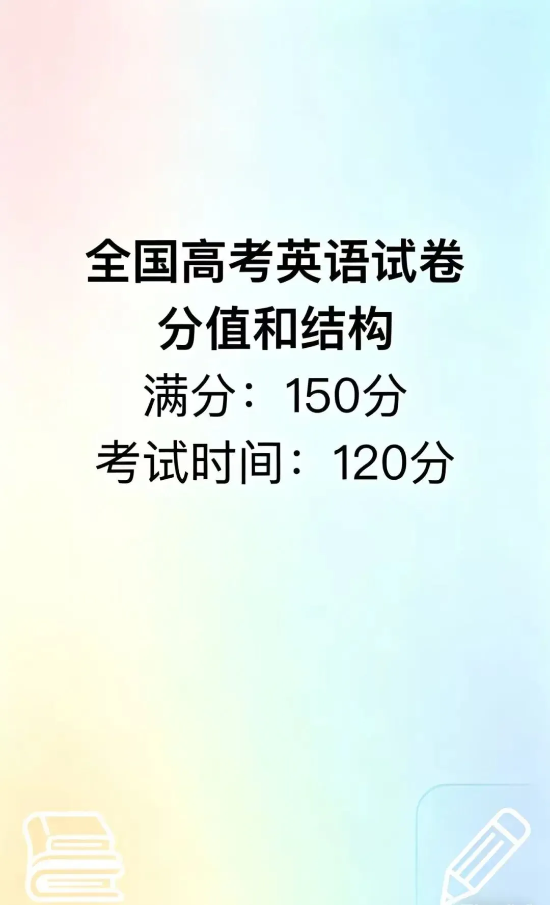 新课标高考英语试卷的满分为150分,考试时间为120分钟。英语试卷包括四个部分:听力30分、阅读理解50分、语言运用30分和写作40分。