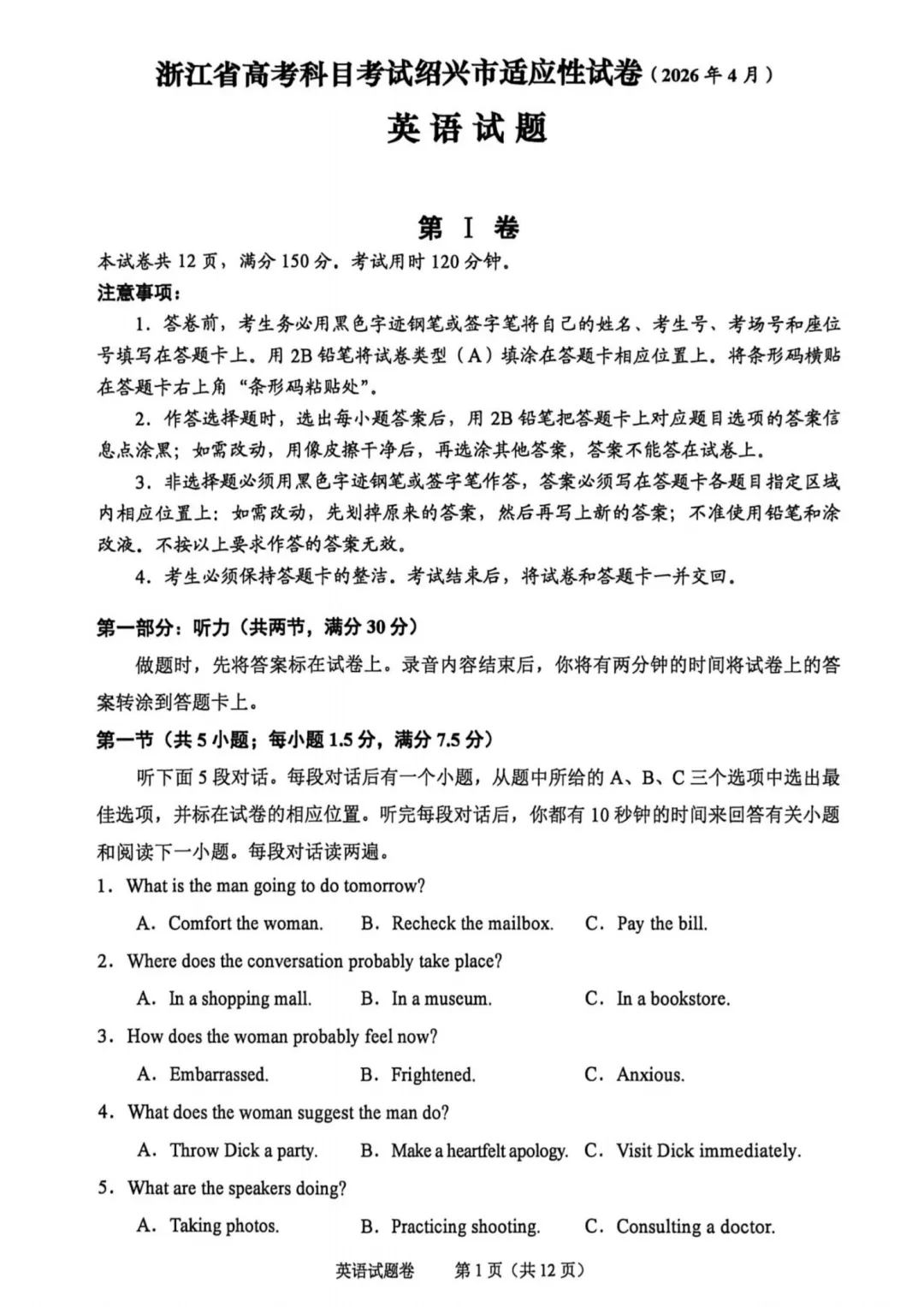 >高三二模|2026年4月绍兴高三二模试卷+答案全(内含下载链接)