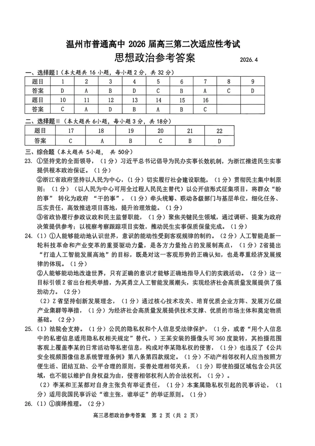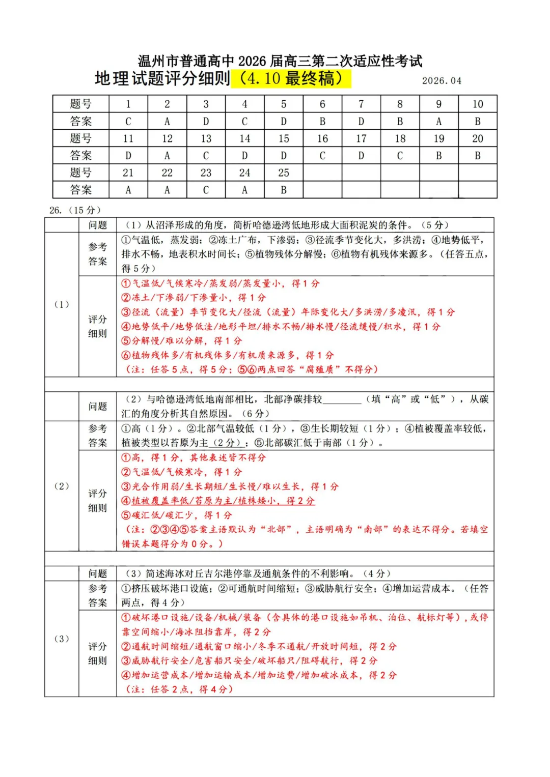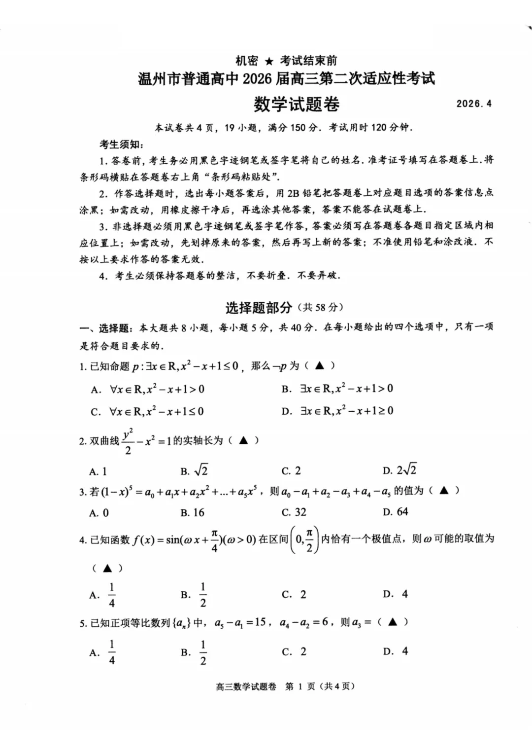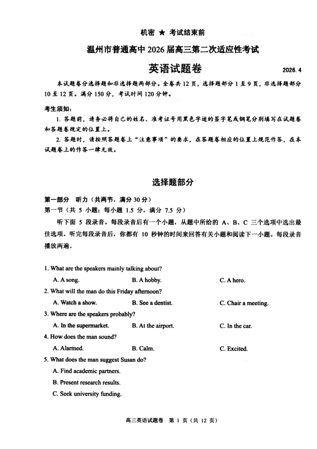 高三二模|2026年4月温州高三二模试卷+答案全(内含下载链接)