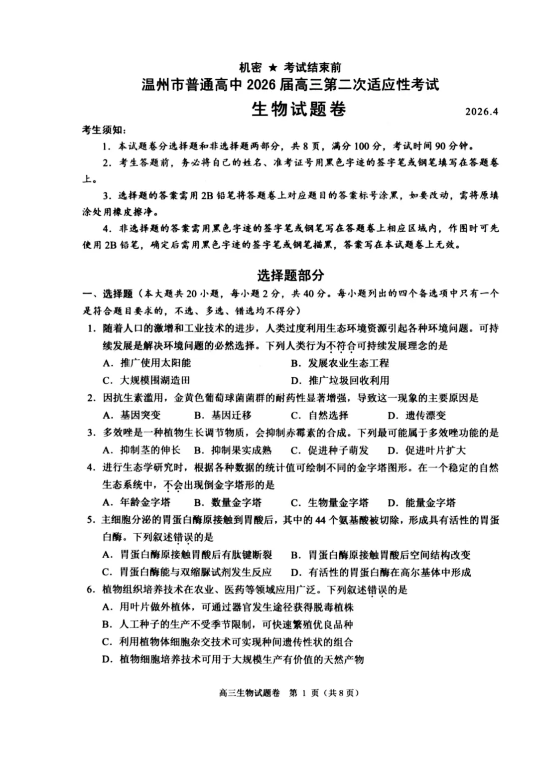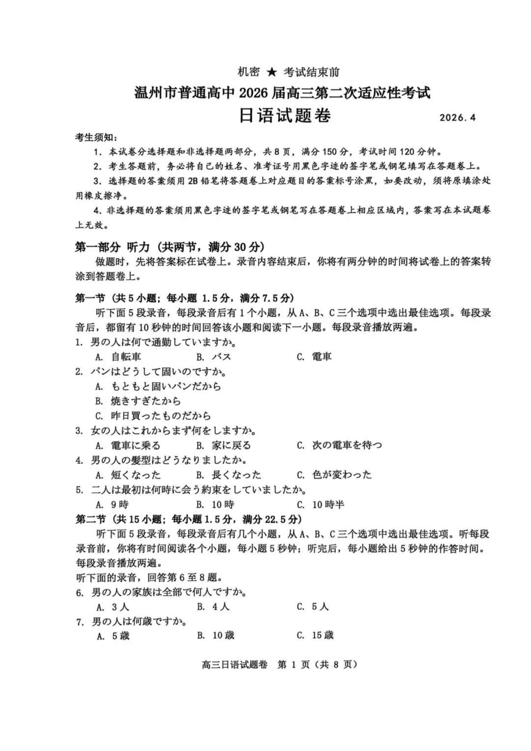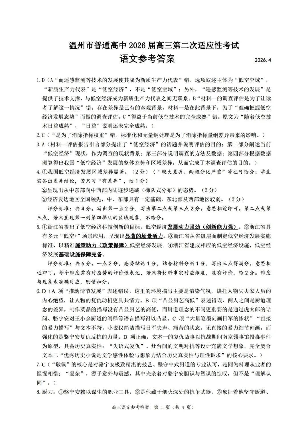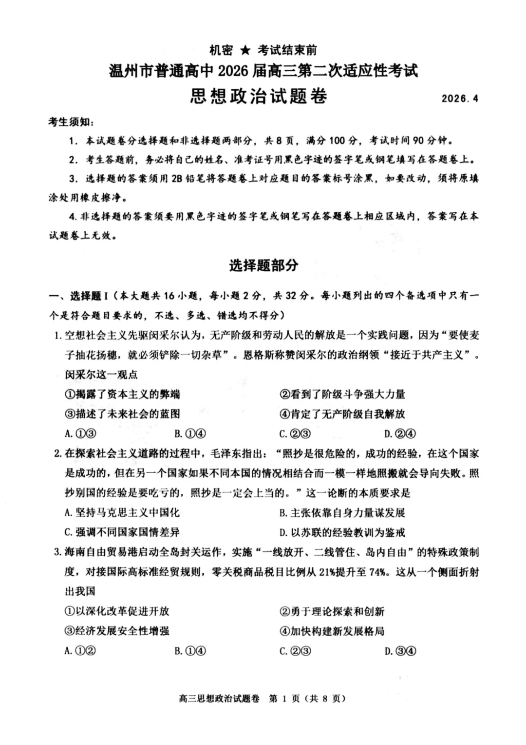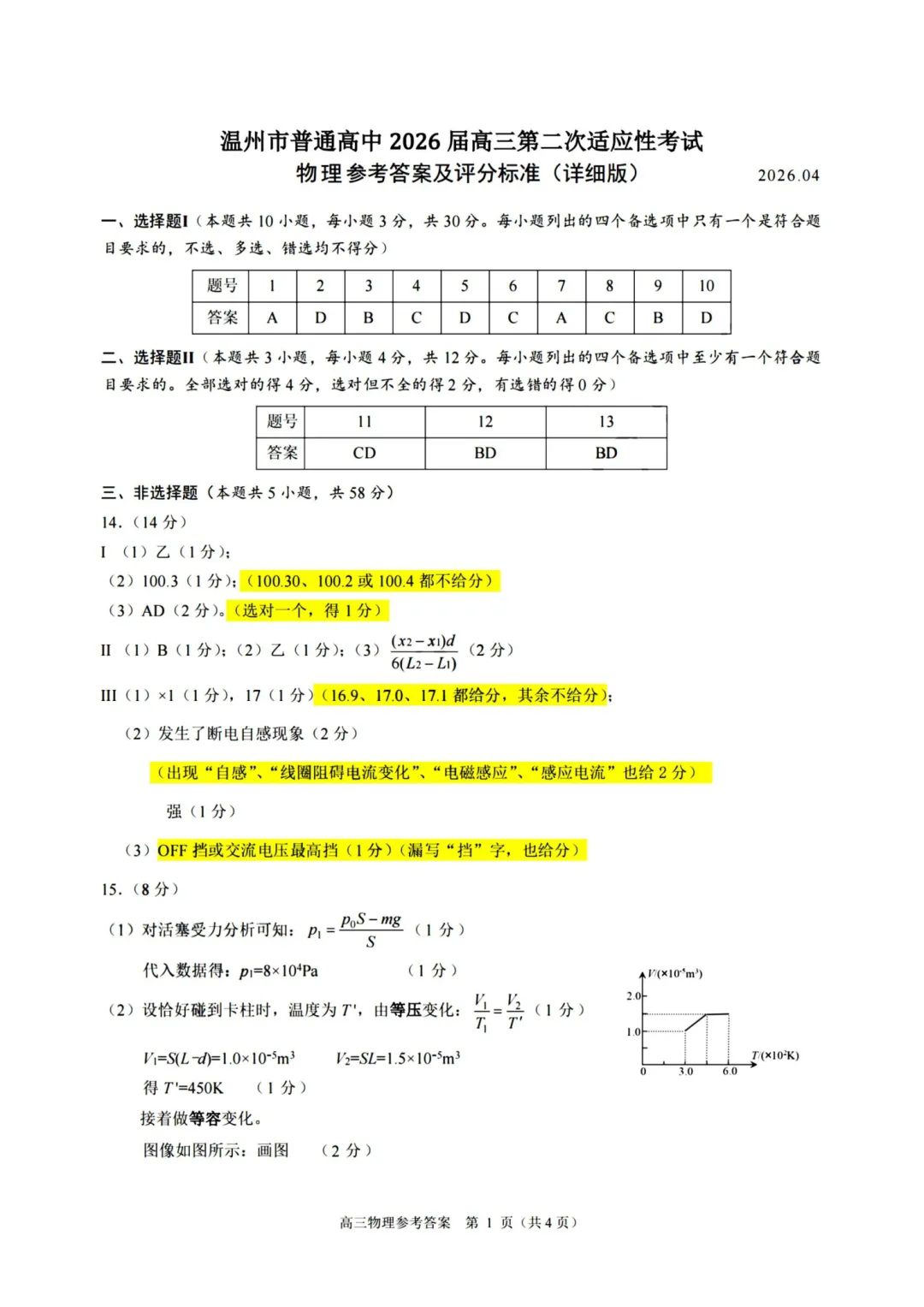 高三二模|2026年4月温州高三二模试卷+答案全(内含下载链接)