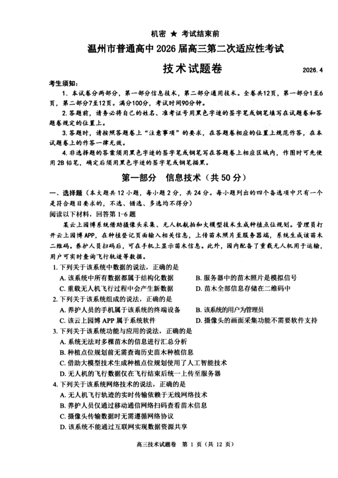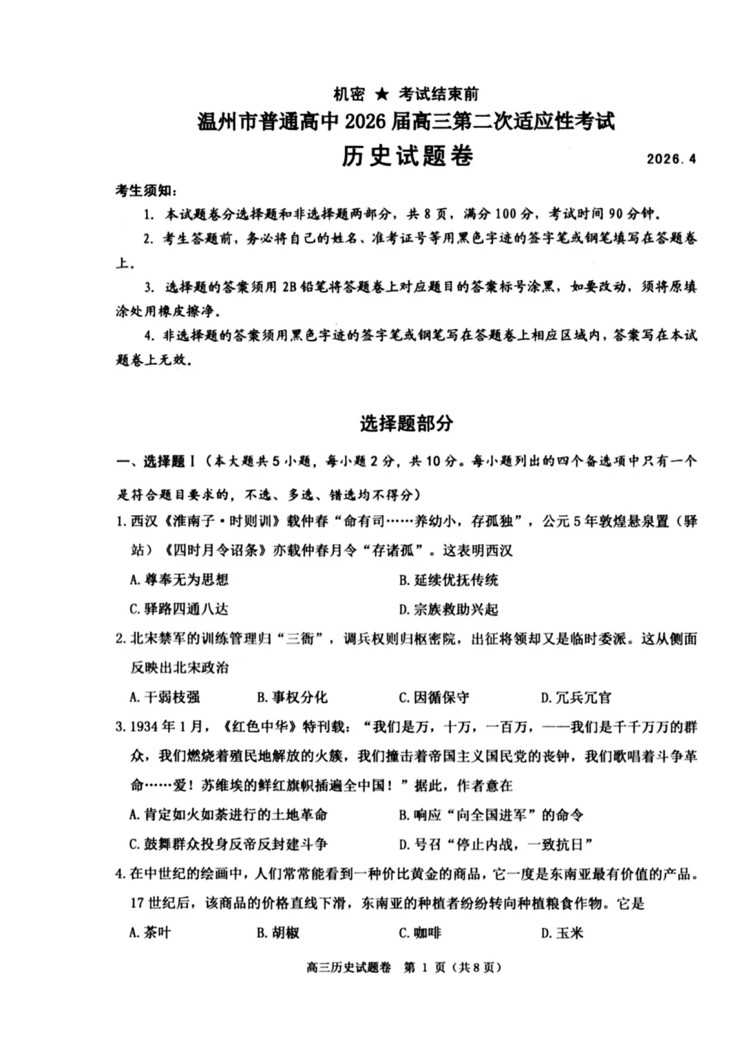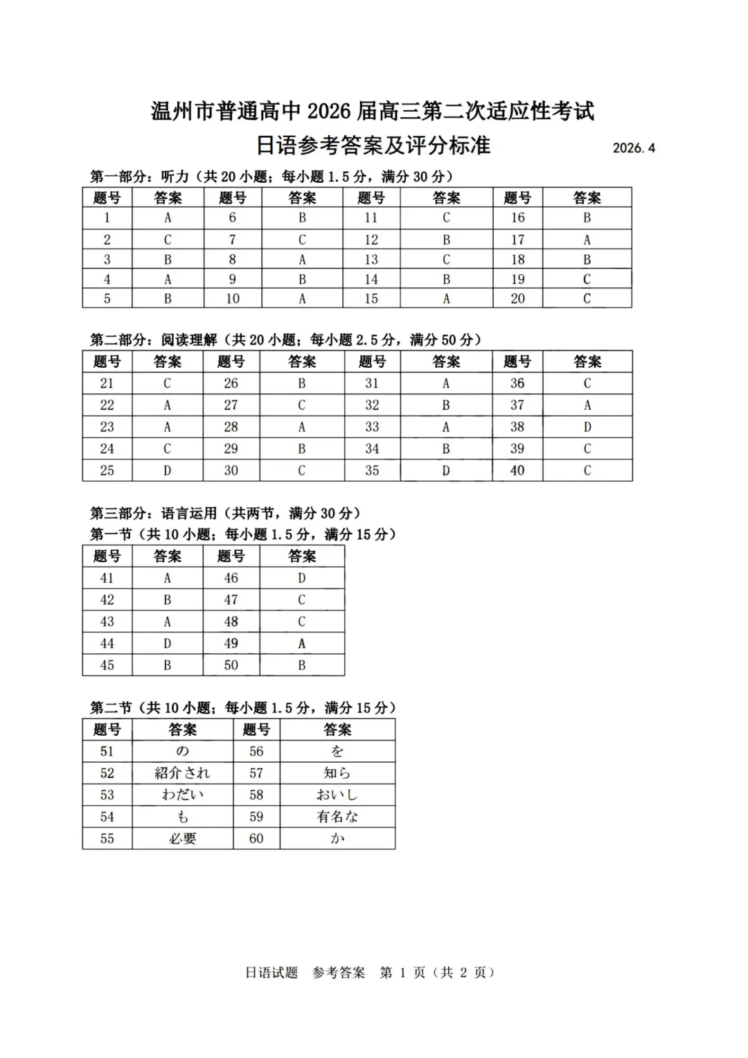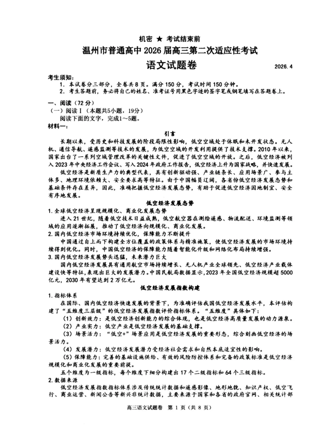 高三二模|2026年4月温州高三二模试卷+答案全(内含下载链接)