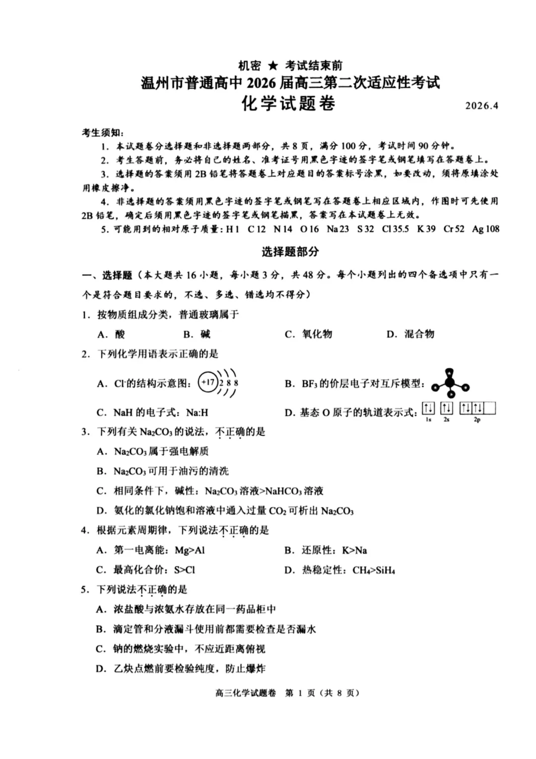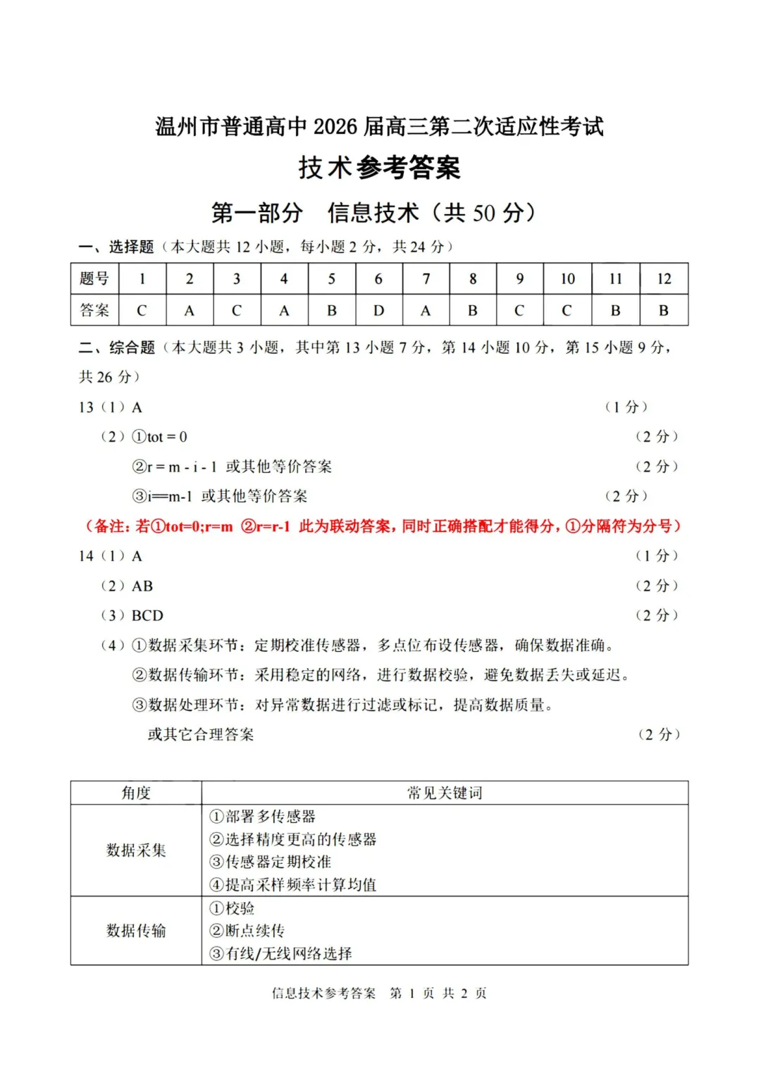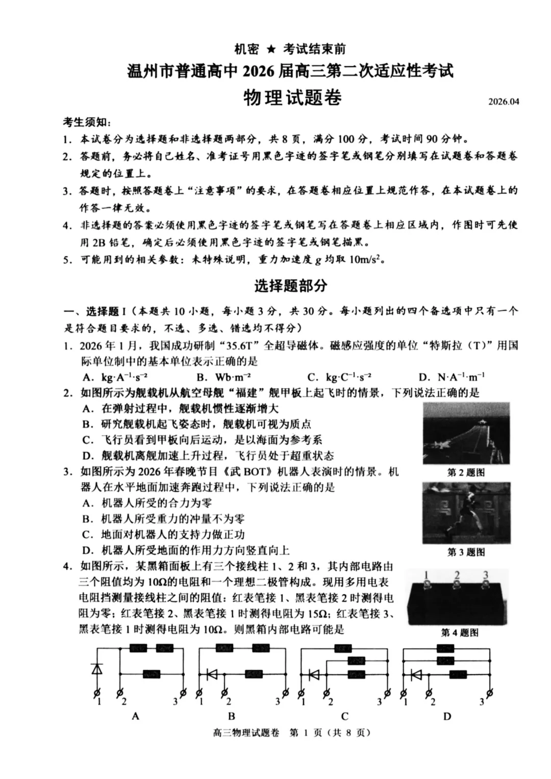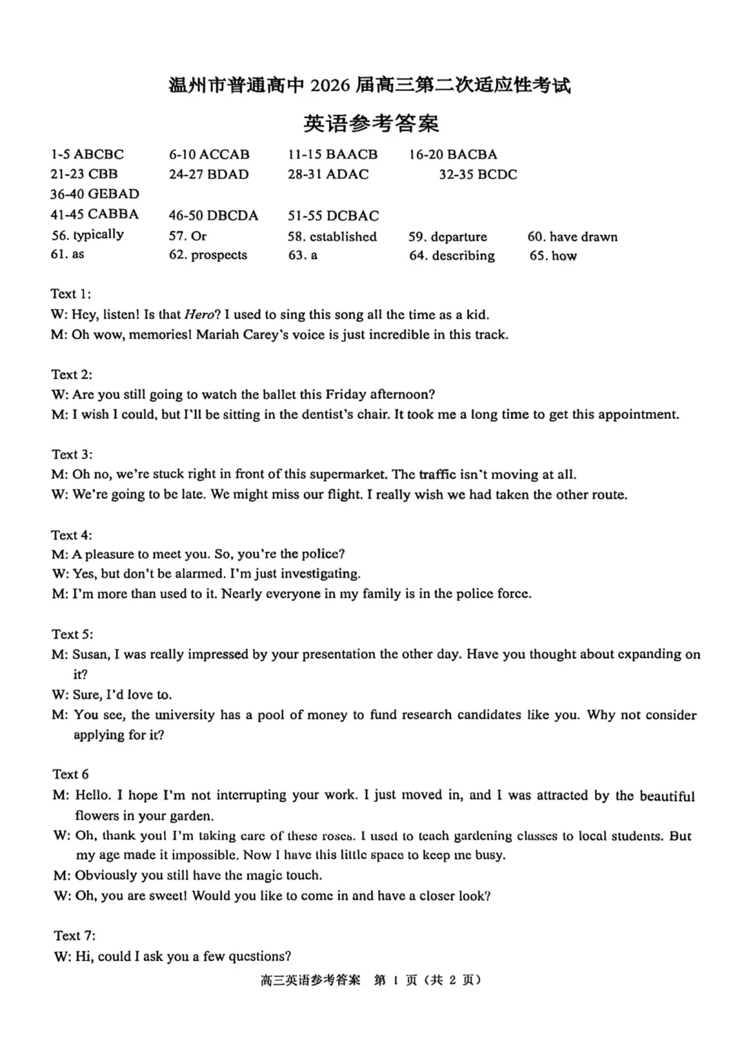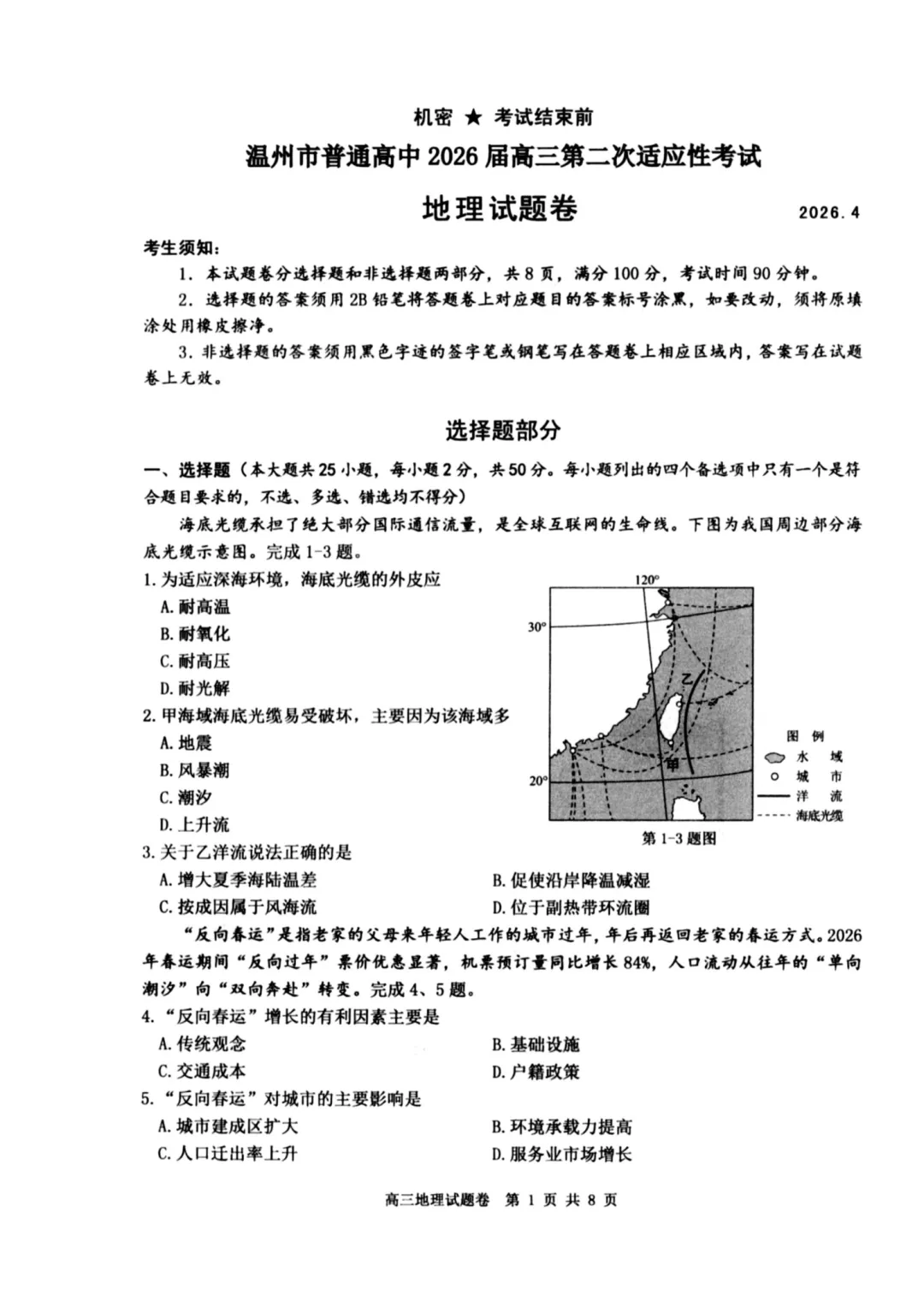 高三二模|2026年4月温州高三二模试卷+答案全(内含下载链接)