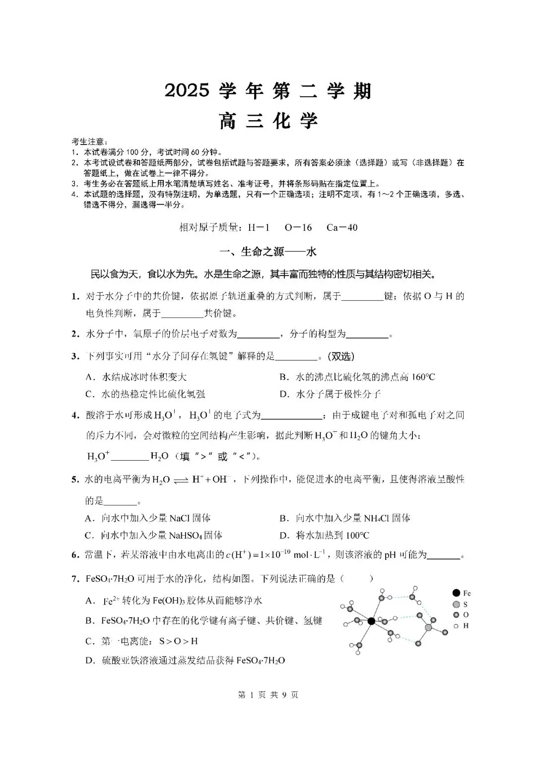 >2026届上海市崇明区高三二模化学试卷(含答案)