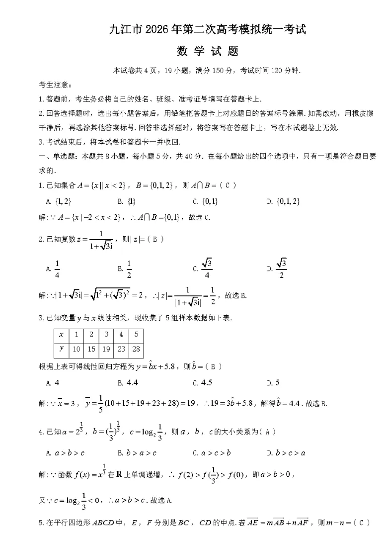 九江市2026年第二次高考模拟统一考试真题及答案解析