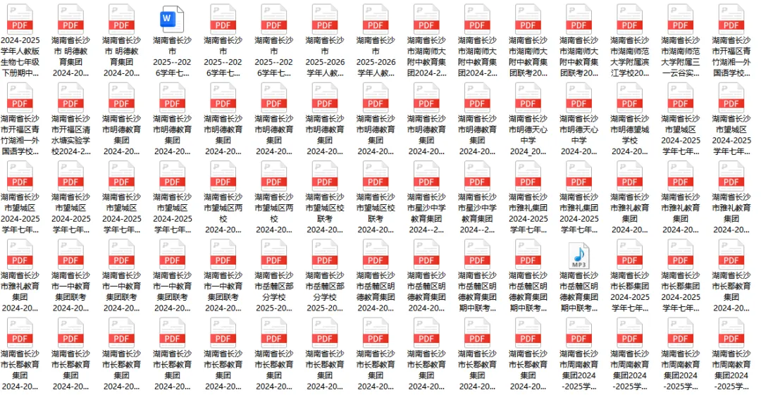 初一:语数英政史生地(七科全):含长郡、雅礼、师大附中、一中、南雅、周南、明德、华益、望城区、长沙县、长郡雨外、开福一中、立信等共173个文档