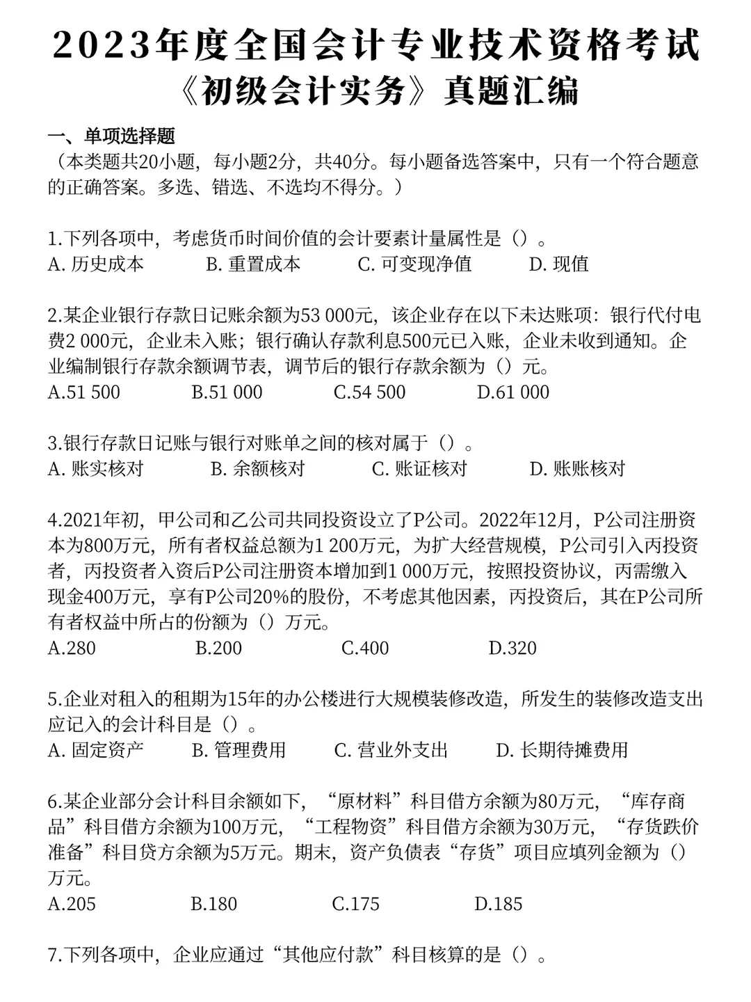 初级会计实务历年真题卷解析