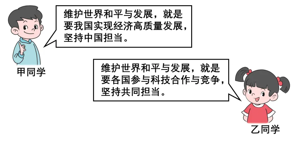 【共同发展固安全】当今时代,发展利益和安全利益复杂交织。中国在促进本国经济和科技发展的同时,倡议各国参与全球安全治理,维护世界和平与发展。同学们对此进行了辩论。