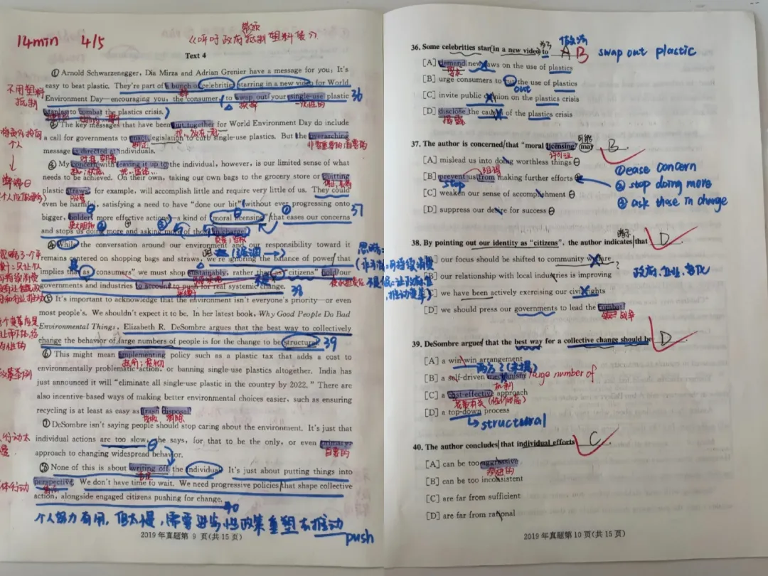 我阅读只刷了英语二的,从头到尾刷了两次,我每天都会花将近两个小时,甚至两个半小时,用来做题+复盘,复盘真的很重要,我下面来说说我复盘的具体步骤: