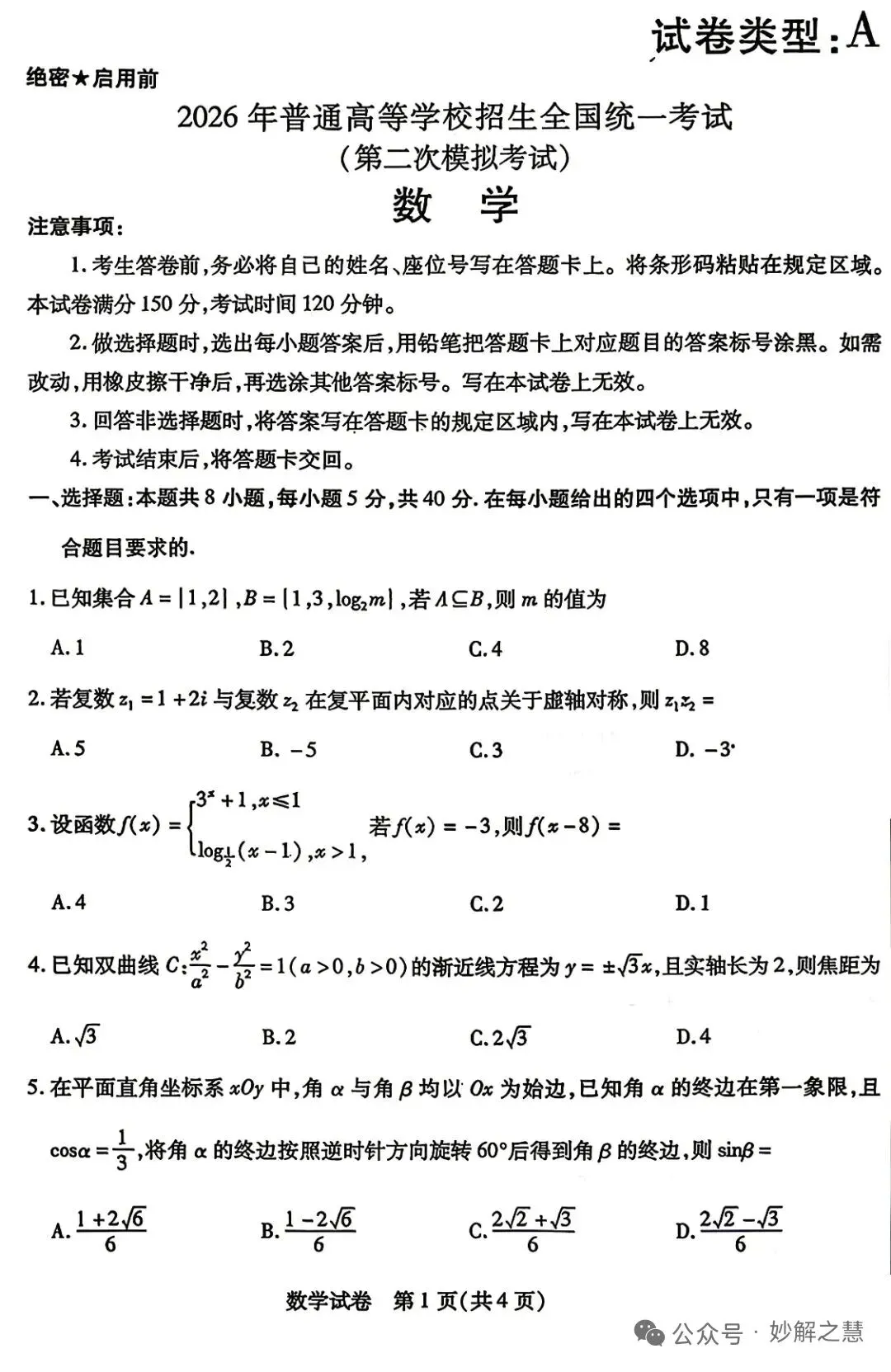 2026届内蒙古包头二模数学试卷