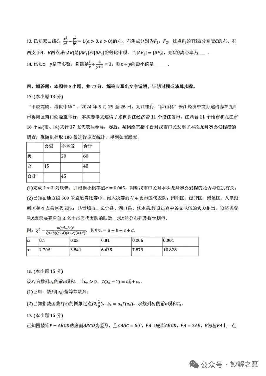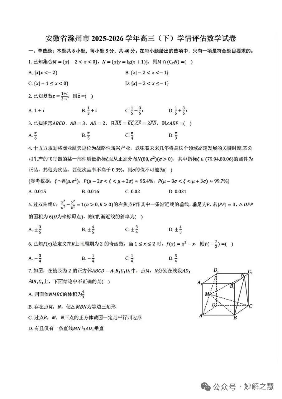 >安徽滁州市2026届高三下学期二模数学试卷及答案