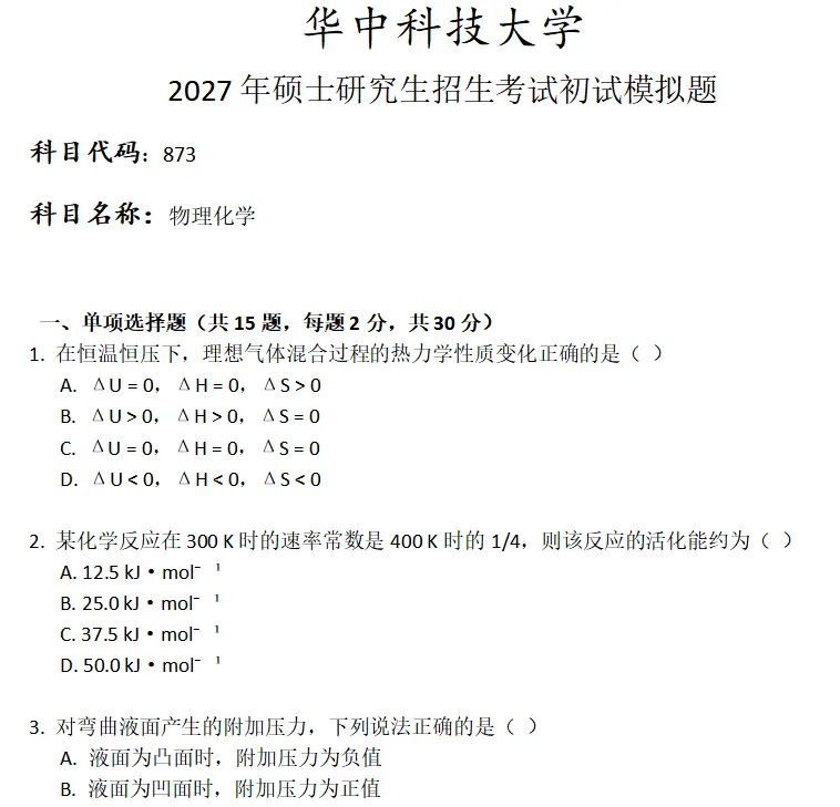当前位置:首页>考研真题>华中科技大学873物理化学考研真题模拟