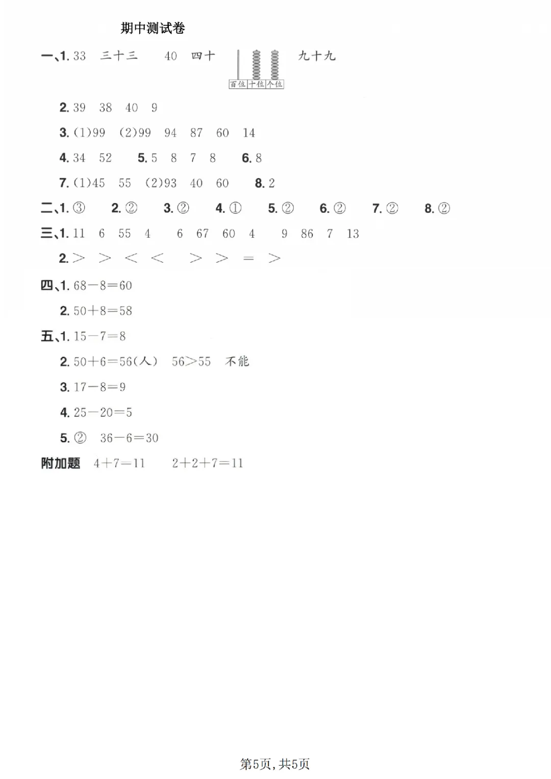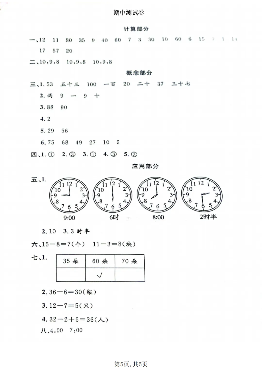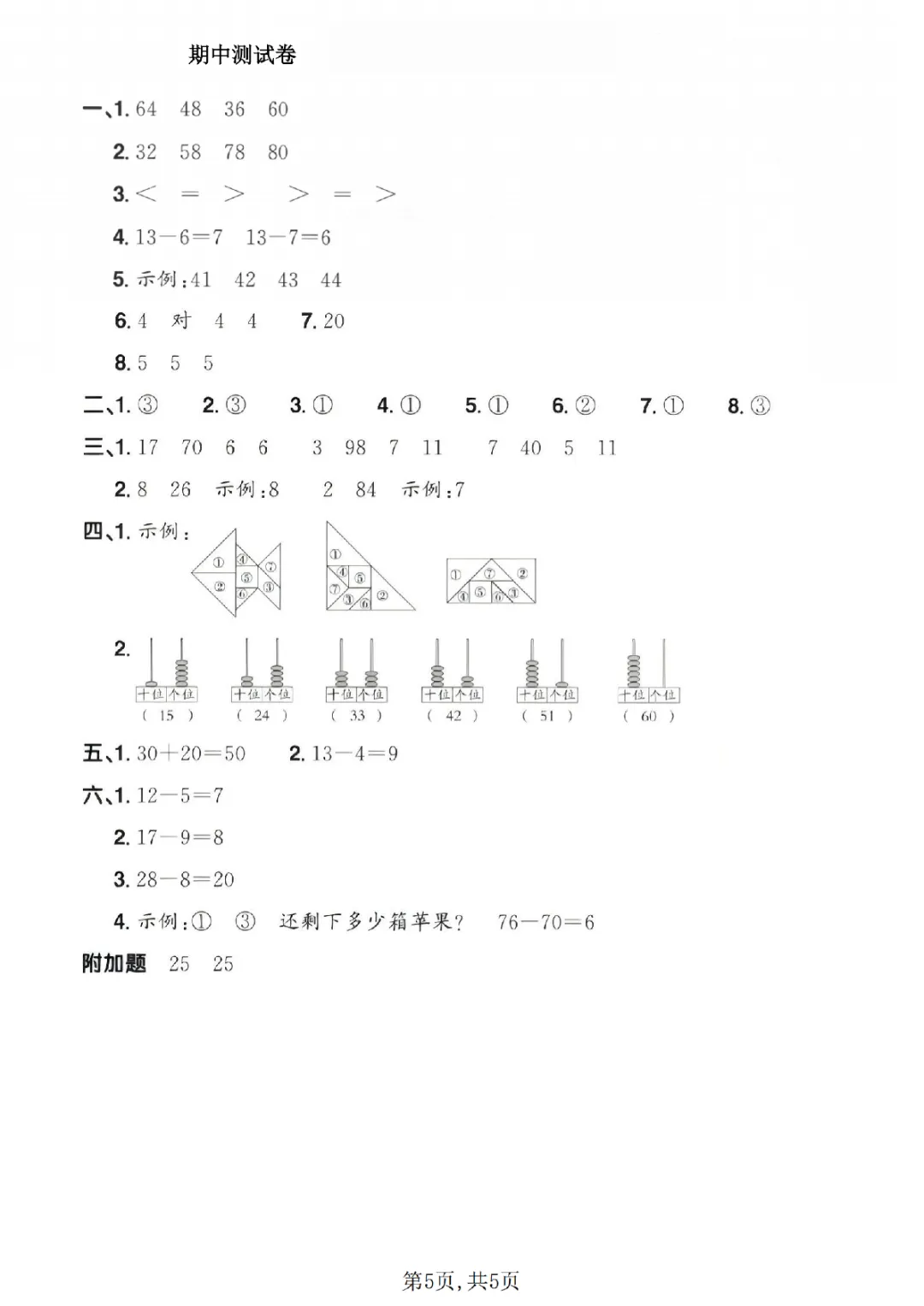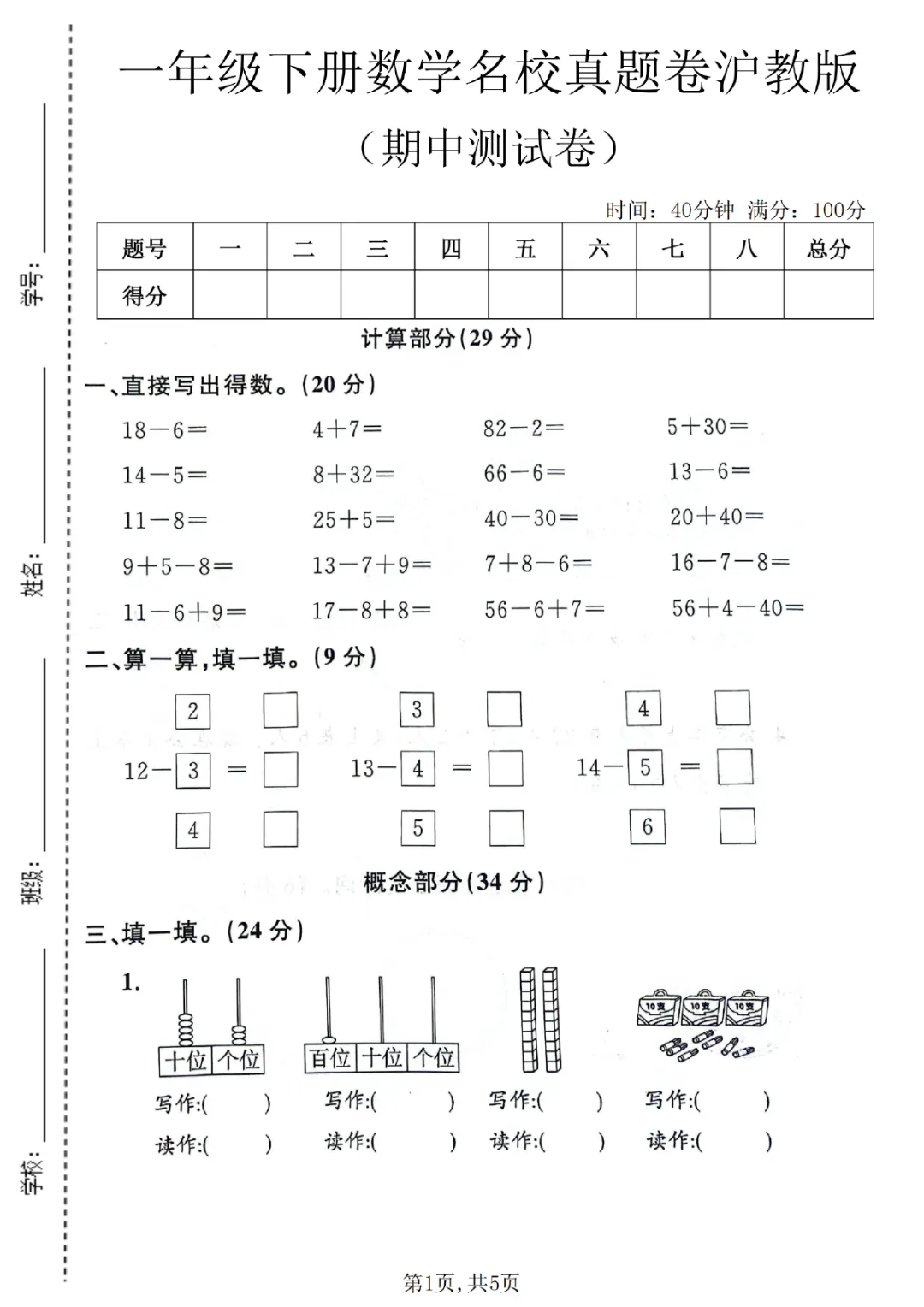 2026年一年级下册数学期中试卷(共5套)(电子版可打印)