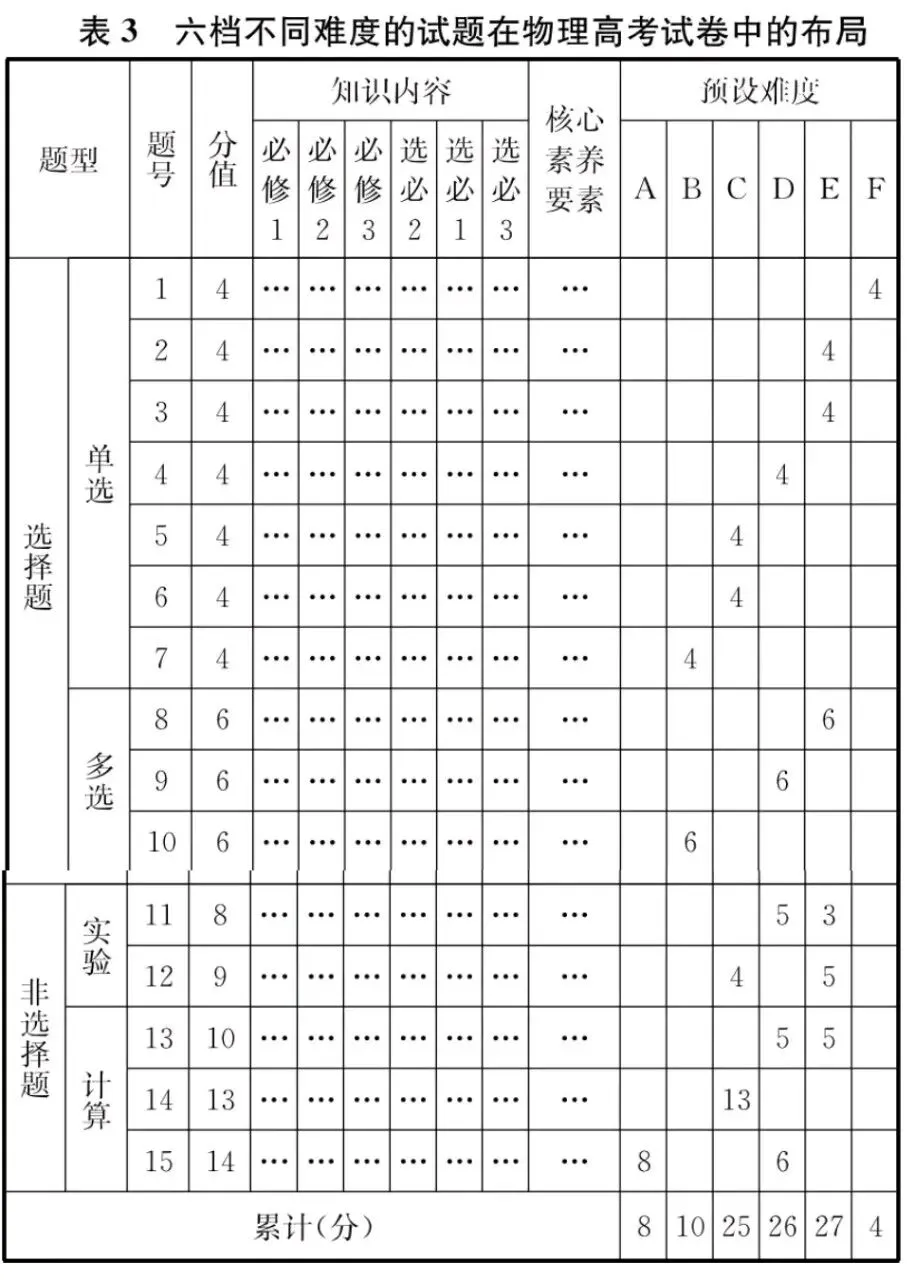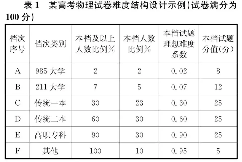 考虑到招生高校的层次,物理试卷的题量,试题的最小赋分值等因素,物理高考试题的难度分为个六个档次比较恰当。这六档难度的试题,对应着录取五个不同层次的高等学校的学生和未能录取的学生(用A, B,C,D,E,F表示)。它们分别是传统意义上的"985大学(A),211大学(B),传统一本(C),传统二本(D),高职专科(E),其他(F)"六档。虽然新高考把传统一本和二本合并为本科批次,但传统一本和二本的差别仍然是存在的,而且招生人数众多,有必要在命题时把两者分开。以上其他(F)档,是指未能录取的学生等。