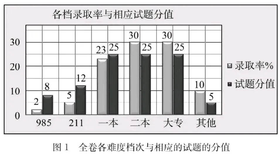 要使试题的难度档次对相关层次大学录取的甄别最有效,理想化的试题难度系数应该和该层次大学的招生录取率相等。由于不同区域的客观情况不一样,不同省市各档次的招生比例不同,因而用于区分各难度档次试题的难度系数也将不同,现以假设某省的数据予以说明。