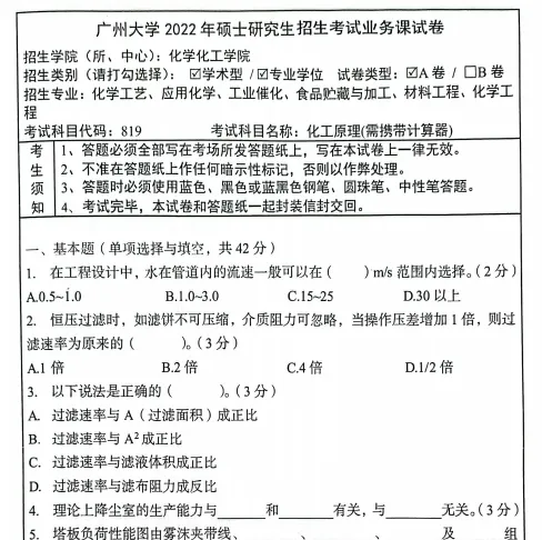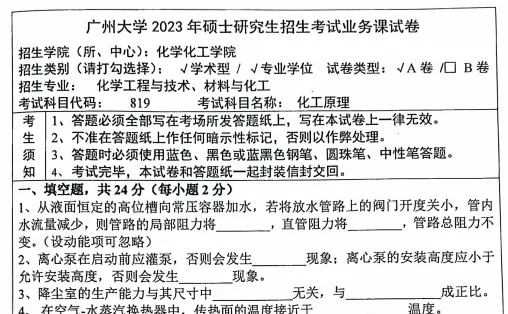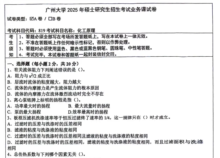2010-2021广州大学819化工原理考研真题手写版本答案