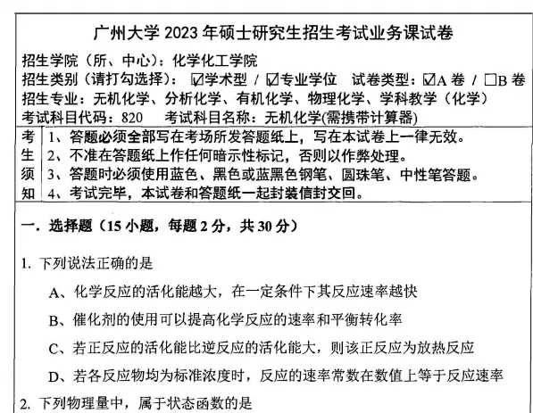 2010-2025年广州大学820无机化学考研真题试卷(原科目代码:616无机化学)