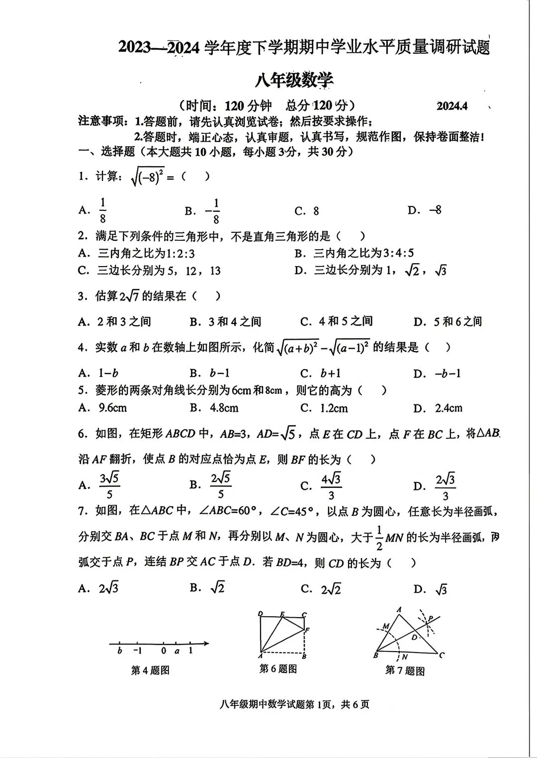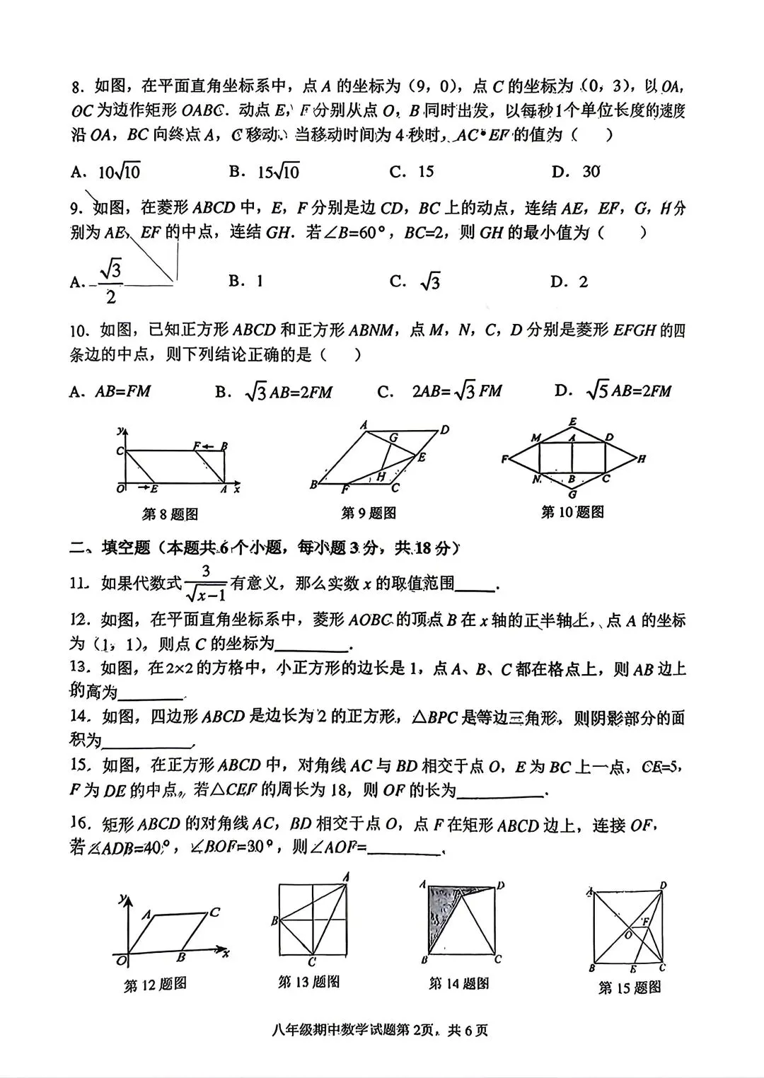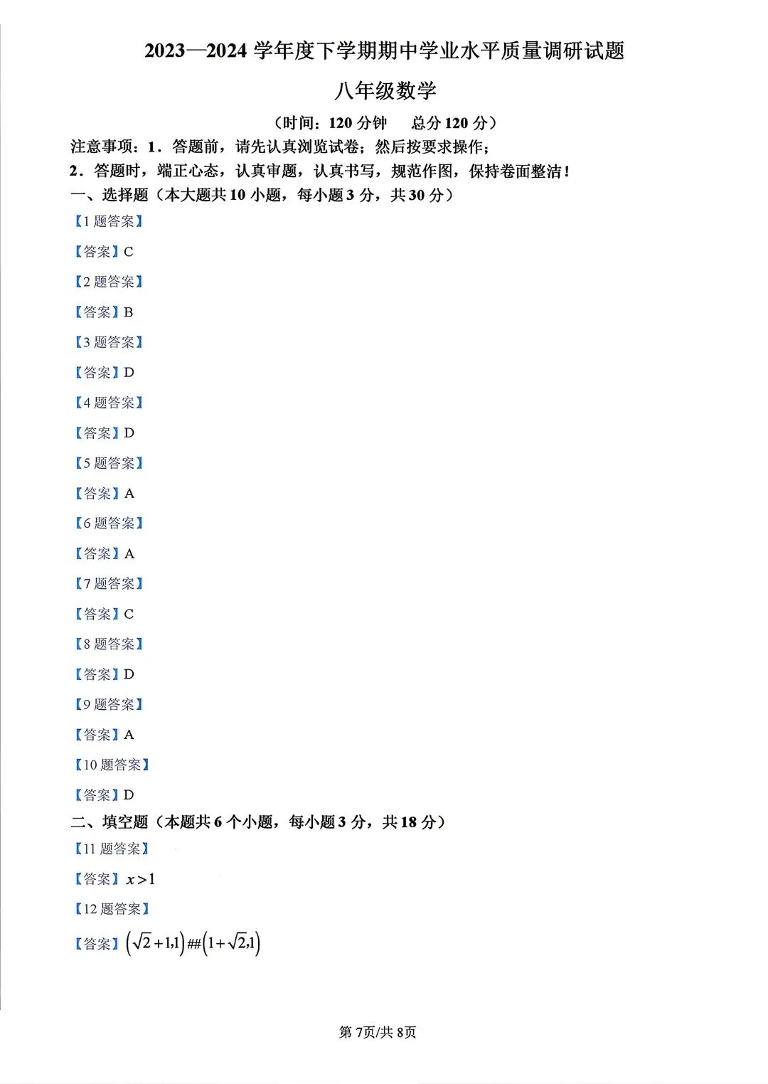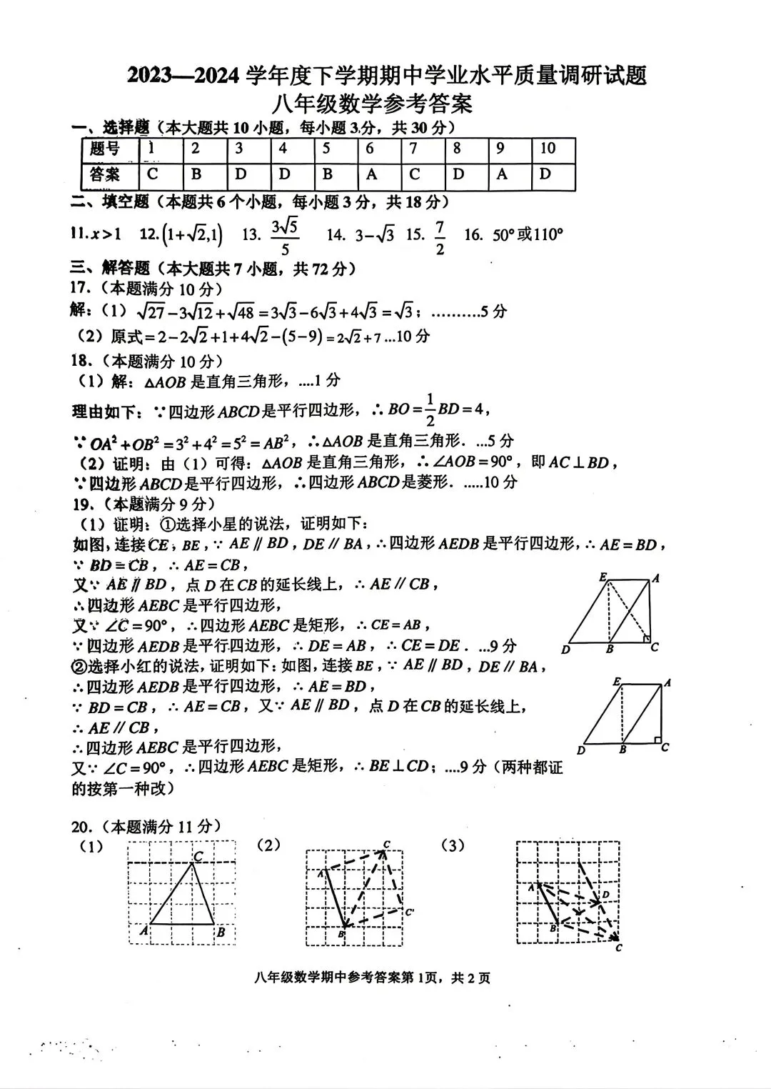 >2023-2024 罗庄区八下数学期中试卷附答案