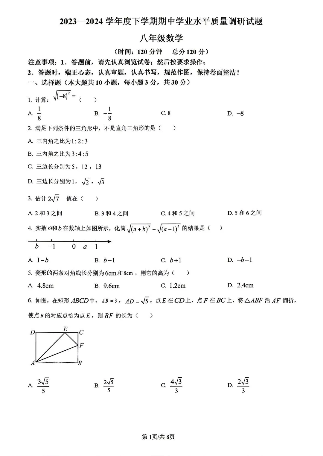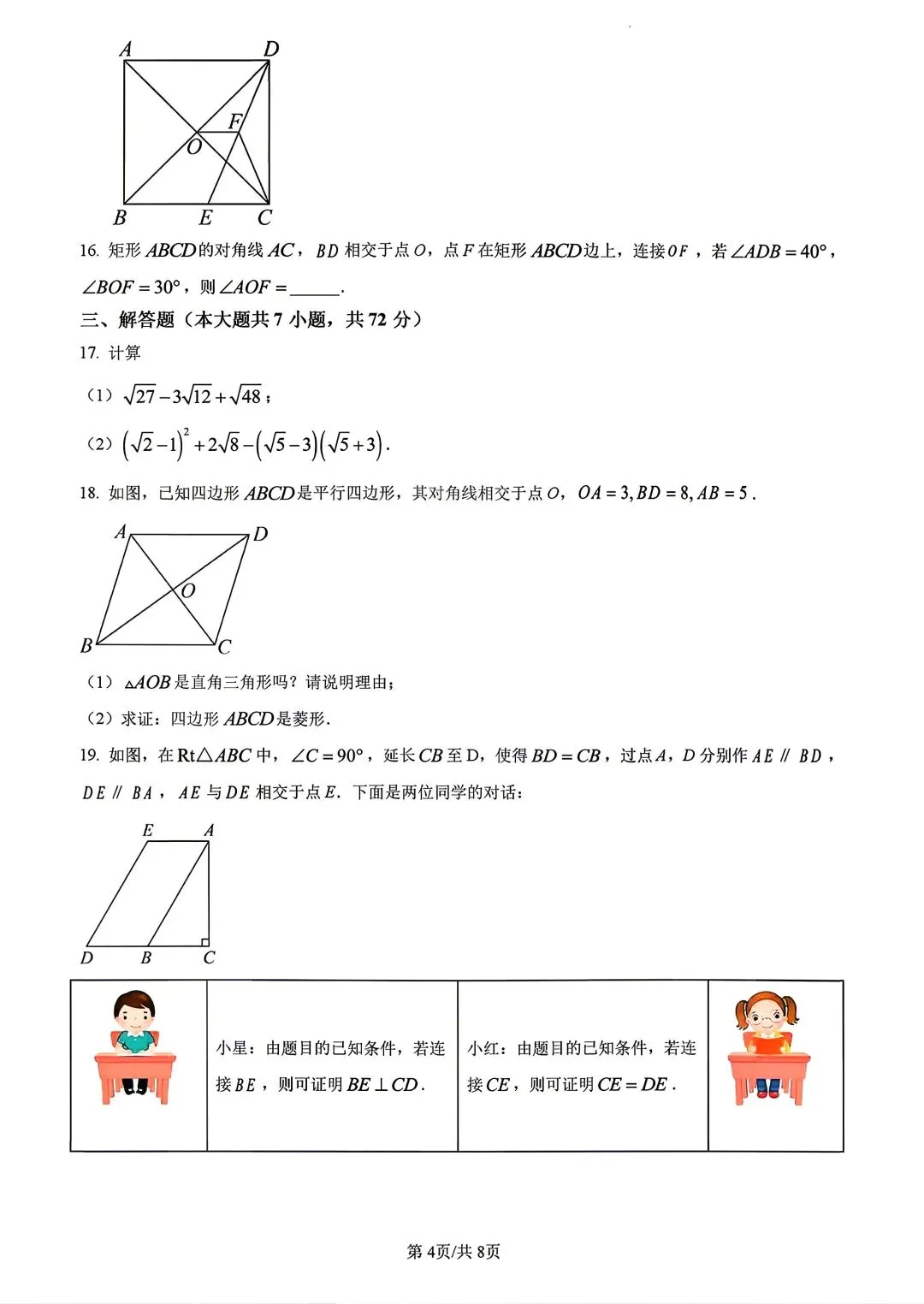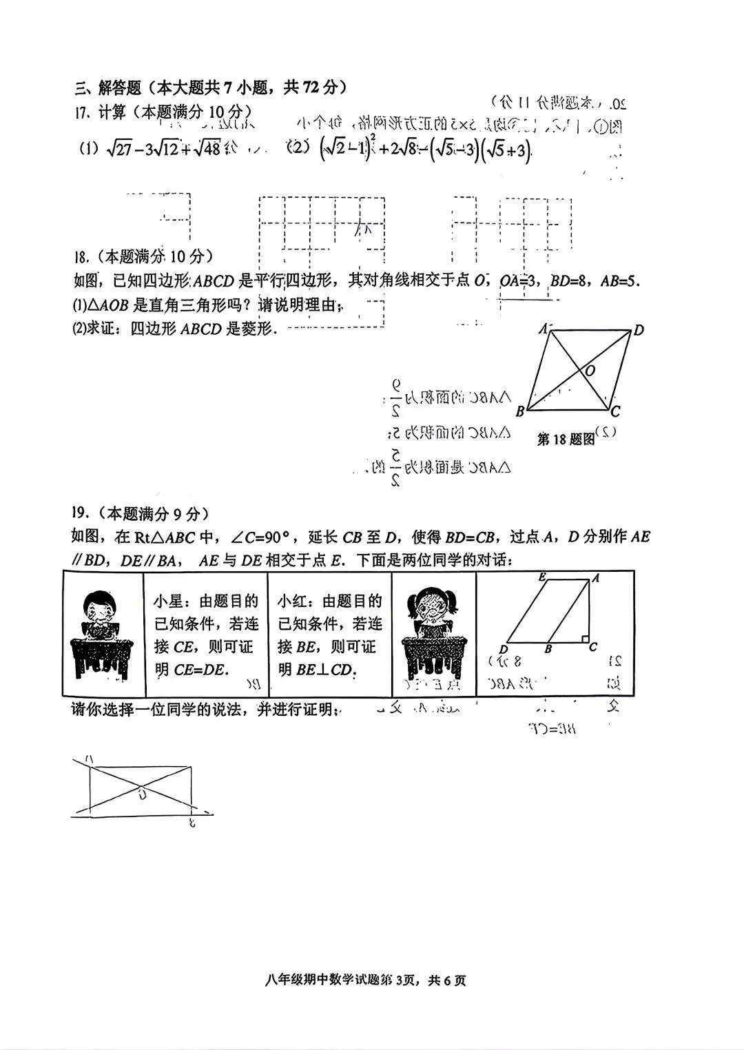 >2023-2024 罗庄区八下数学期中试卷附答案