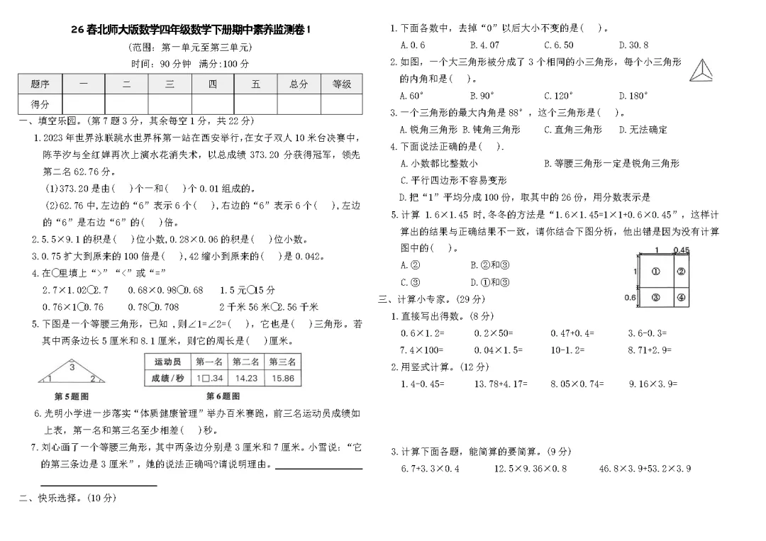 26春北师大版数学4年级下册《期中测试卷》有答案,建议各位家长领取打印给孩子测试!