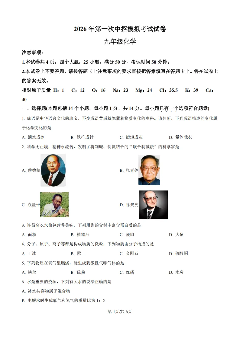 2026年河南省实验中学九下3月中考一模试卷及答案(7科含听力)
