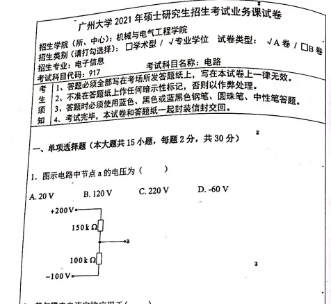 2012-2025年广州大学856电路(原917)考研真题试卷