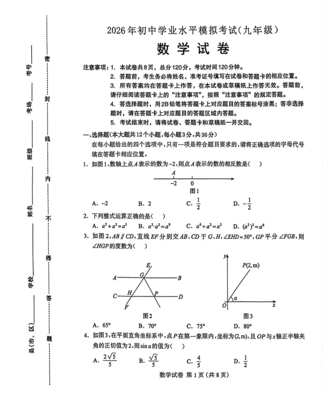 2026河北省中考数学模拟试卷+答案