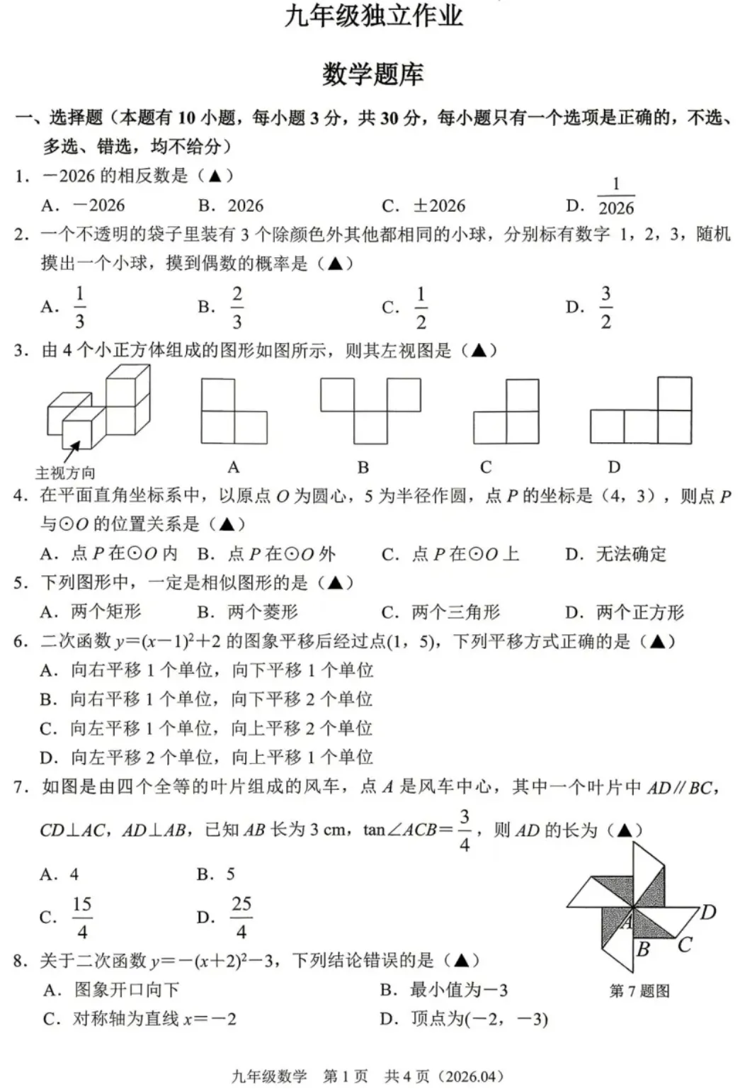 【2026浙江中考模拟数学试卷】温州市平阳县昆阳镇第四中学中考模拟数学试卷(2026.3)